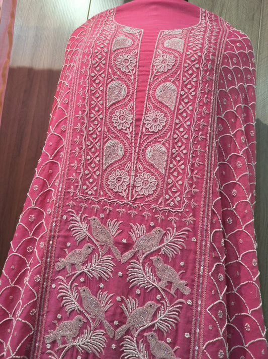 Birds Detailed Pure Handcrafted Chikankari Pearl Heavy Embroidery Suit