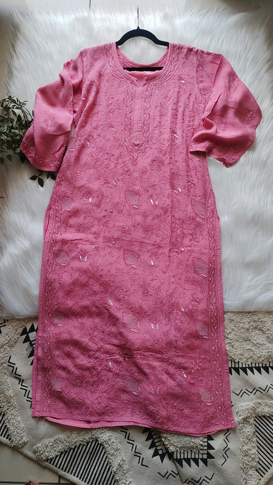 Baby Pink Premium Silk Chikankari Long Kurti (pre booking)