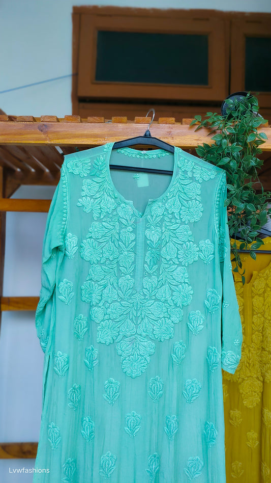 Farah Premium Silk Luxurious Look Chikankari Long Kurta (Unique Back Embroidery)