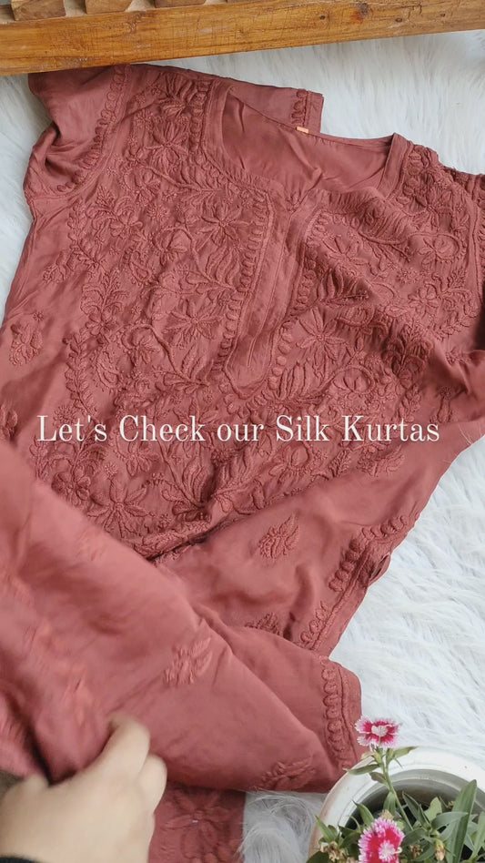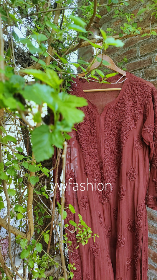 Silk Chocolate Daman Neck Chikankari Embroidery Kurta( Muslin Silk)