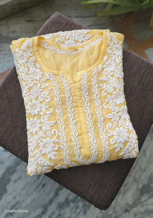 Shine Yellow Premium Silk Chikankari Long Kurta