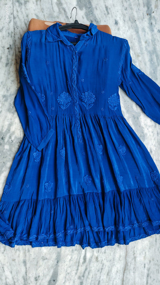 Shine Blue Premium Silk Chikankari Luxurious Long Kurti For women