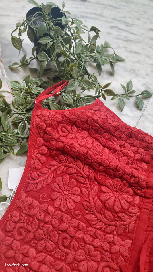 Introducing our Tulip cherry Red Premium Georgette Luxurious Look Tunic! This Chikankari kurti set for...
