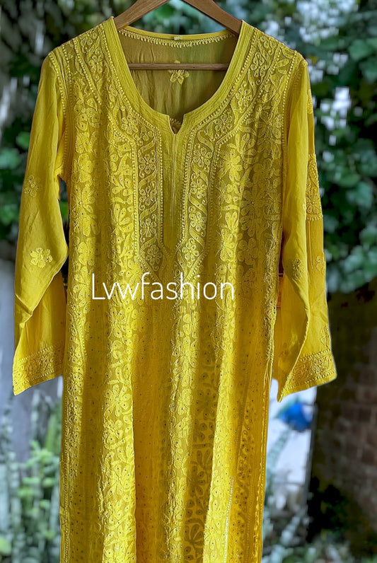 Beautiful Premium Georgette Lemon Yellow Chikankari Kurta With Slip