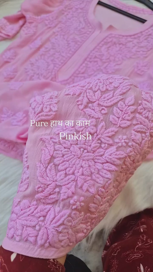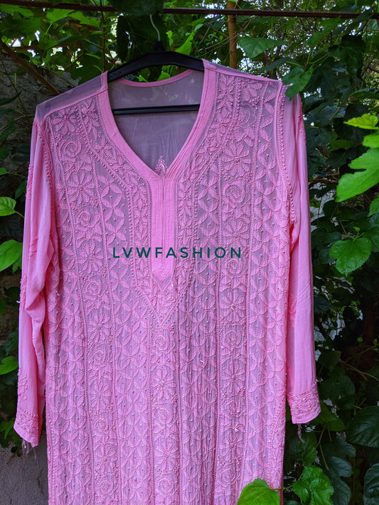 Brigtish pink premium Georgette Chikankari Luxurious Long Kurta