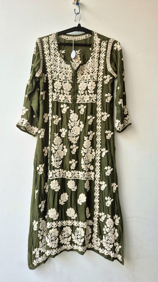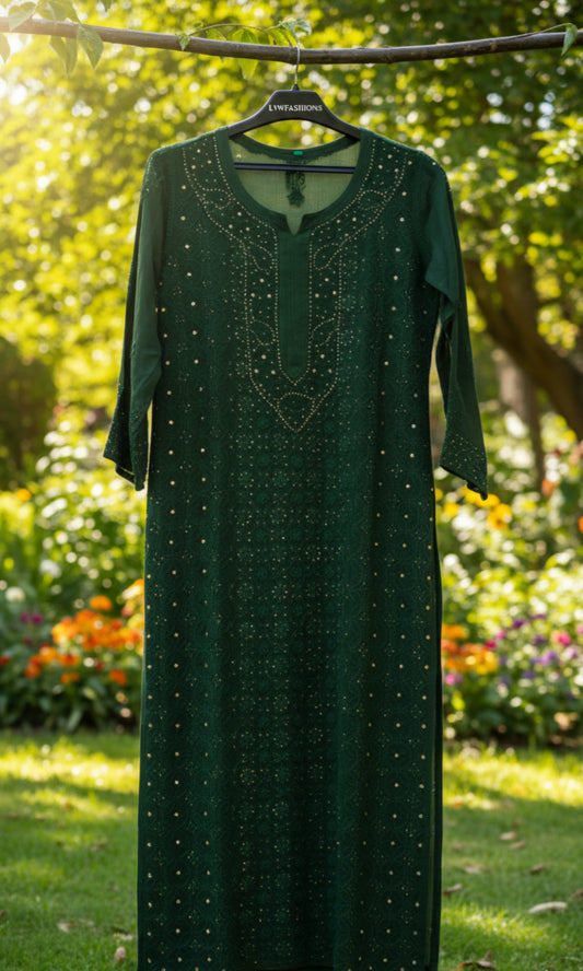 Bottle Green Premium Silk Chikankari Tunic Dress