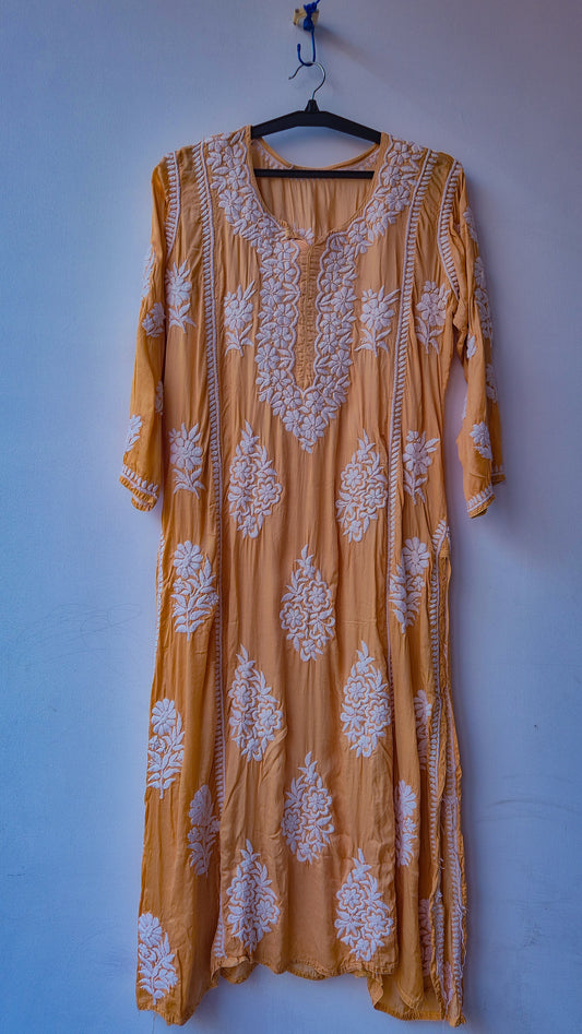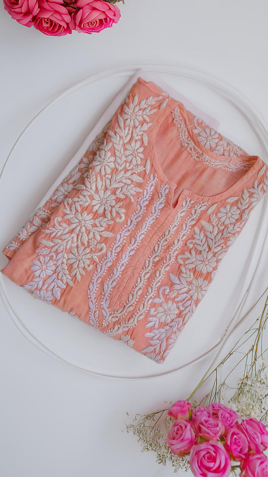 Bright Peach Premium Soft Silk Chikankari Pure Handmade Long Kurti