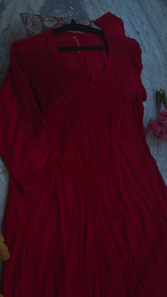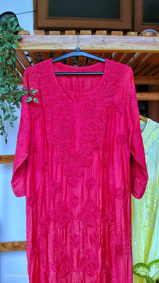 Cherry Red Premium Silk Chikankari Long Kurta (Hand Embroidery Specially)
