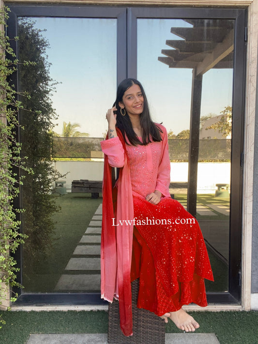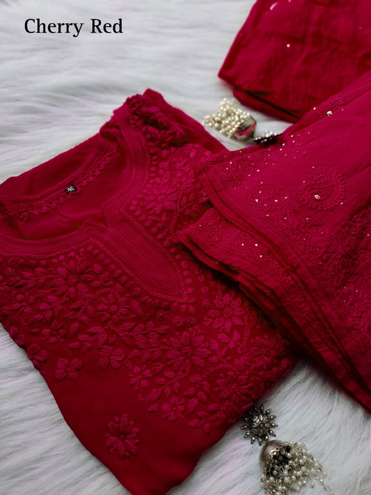 Cherry Red Premium Georgette Gharara Chikankari Set