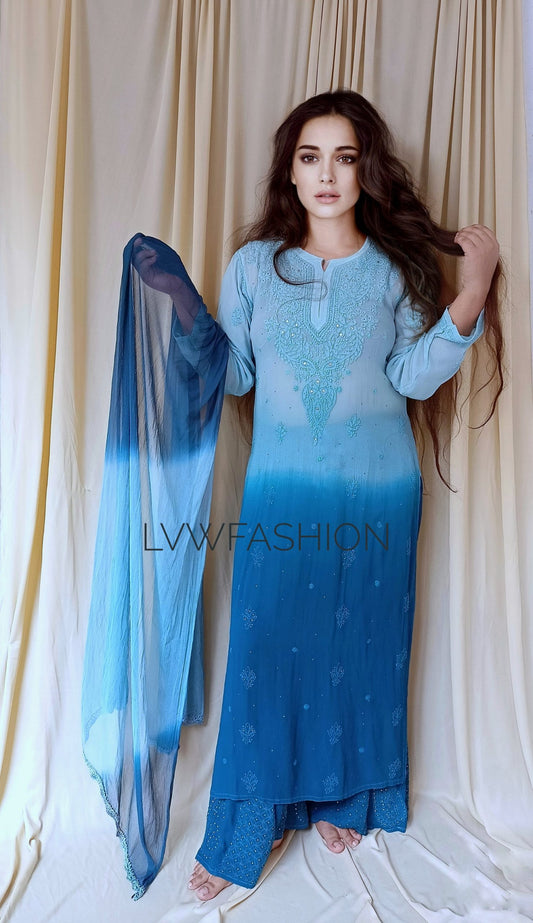 Christmas Blue Premium Georgette Chikankari Kurti Set