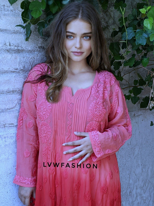 Double Shade Noori Full Jaal Pearl Cutdana Chikankari Embroidery Long Luxurious kurta Pure Handcrafted