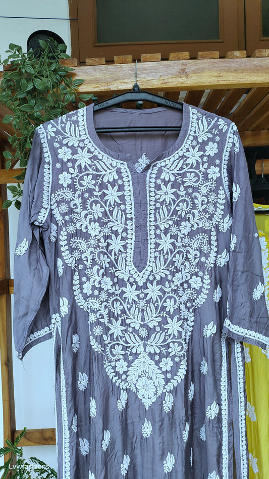 Falak Grayish Blue Premium Silk Chikankari Kurta Heavy Neck Design