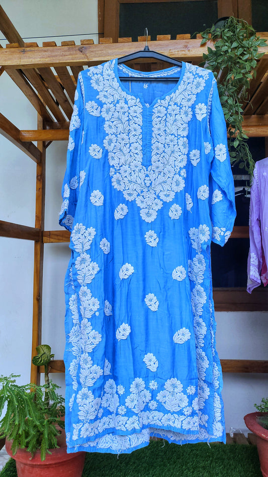 Farah Blue Premium Silk Luxurious Look Chikankari Long Kurta (Unique Back Embroidery)