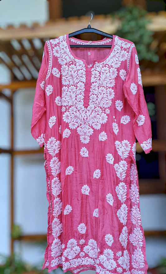 Farah Hot Pink Premium Silk Luxurious Look Chikankari Long Kurta (Unique Back Embroidery)