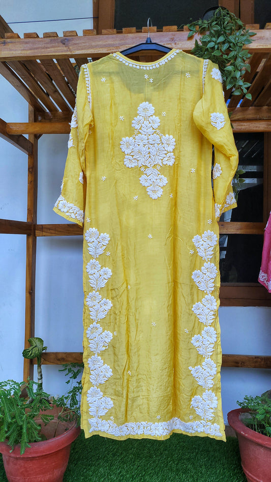 Farah Yellow Premium Silk Luxurious Look Chikankari Long Kurti (Unique Back Embroidery)