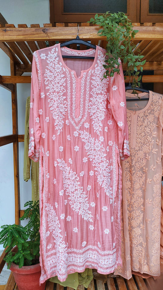 Feriha Brightish Peach Premium Silk Chikankari Long Kurta