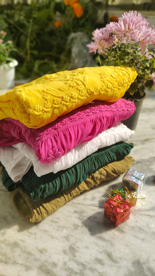 "Experience luxury and elegance with our Gold Rose Premium Mul Silk Chikankari Kurta Set. Handmade...