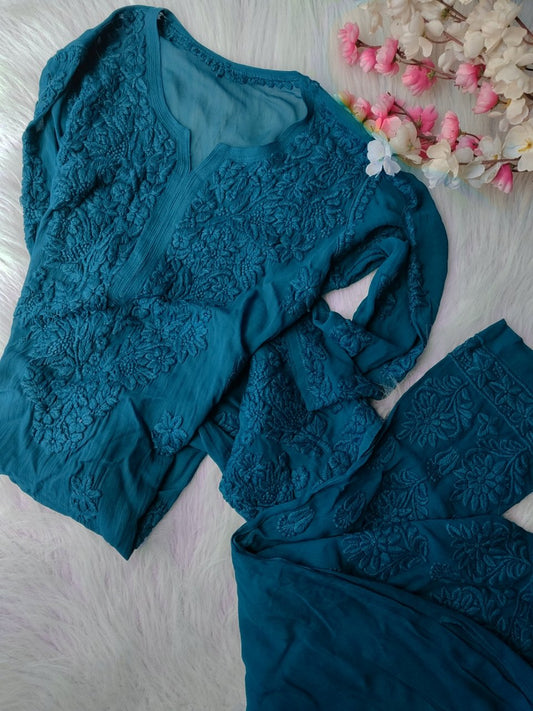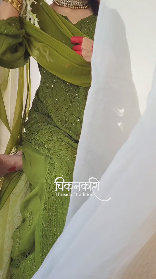 Mehandi Premium Georgette Chikankari Luxurious Kurti set for women Mukaish Add On