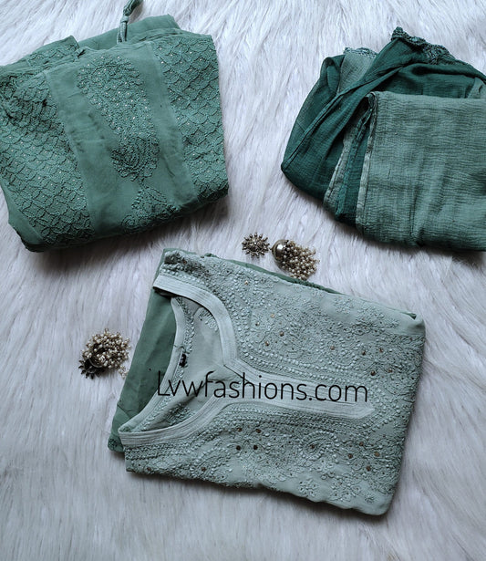Myrtle Green Premium Georgette 3 Piece Set Of Chikankari & Kamdani