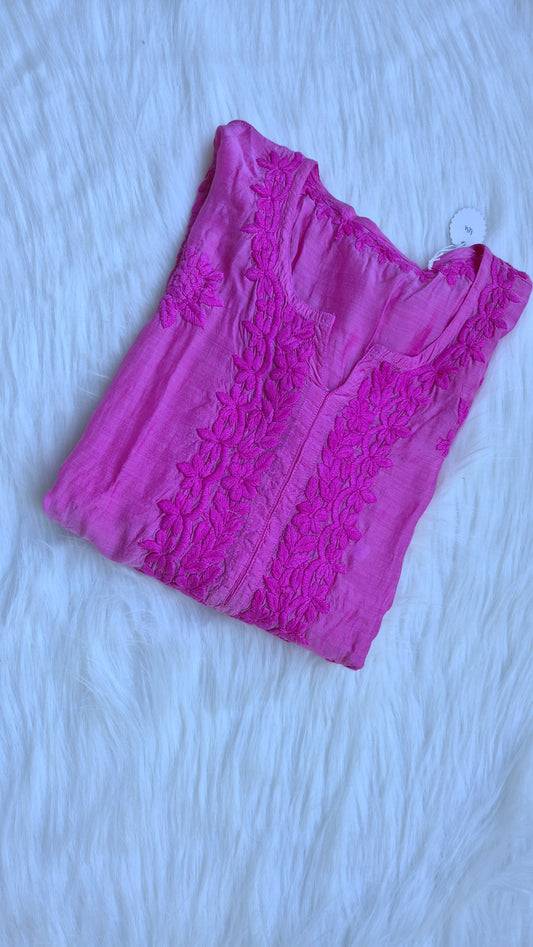 Pinkish Heavy Pure Handcrafted Embroidery Premium Silk Chikankari Kurti set for Women