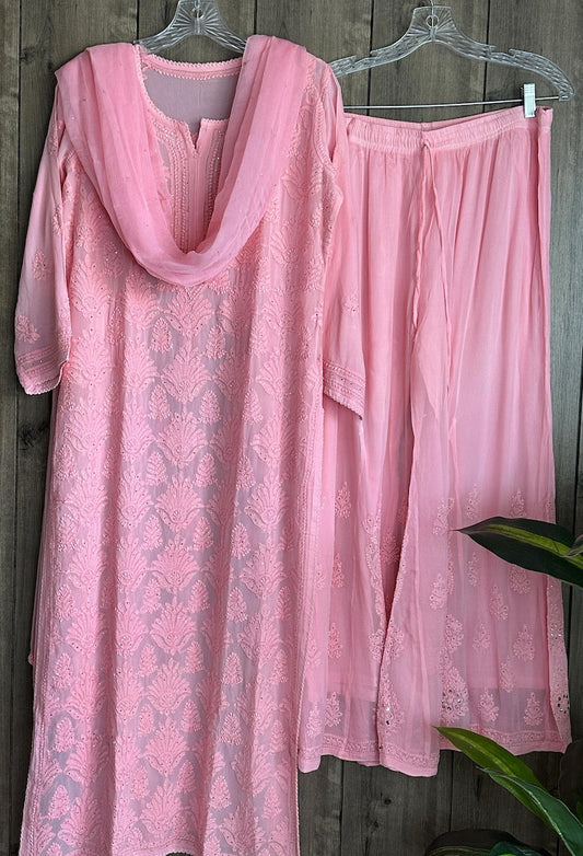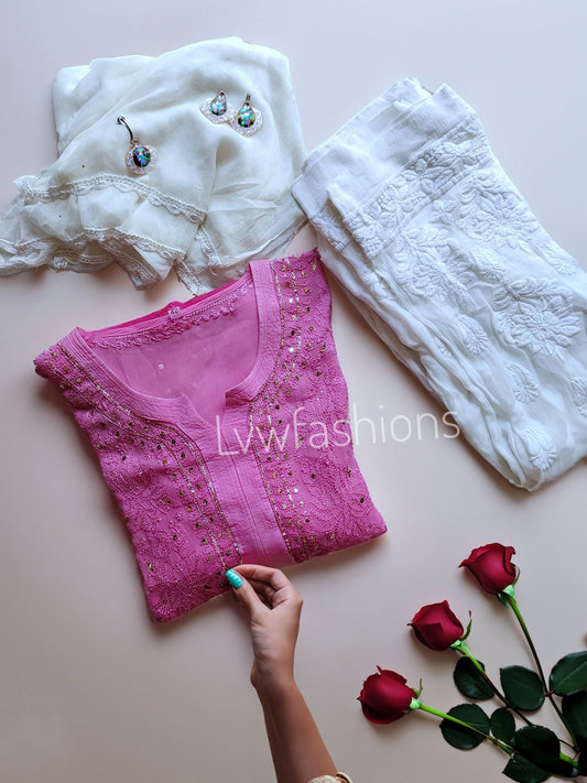 Pink Farah Premium Georgette Chikankari Luxurious Kurta Mukaish Add On