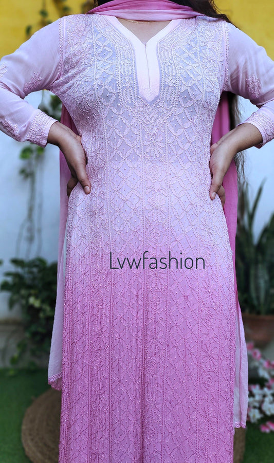 Pink Ombre Noori Premium Georgette Chikankari Kurta Cutdana Embroidery