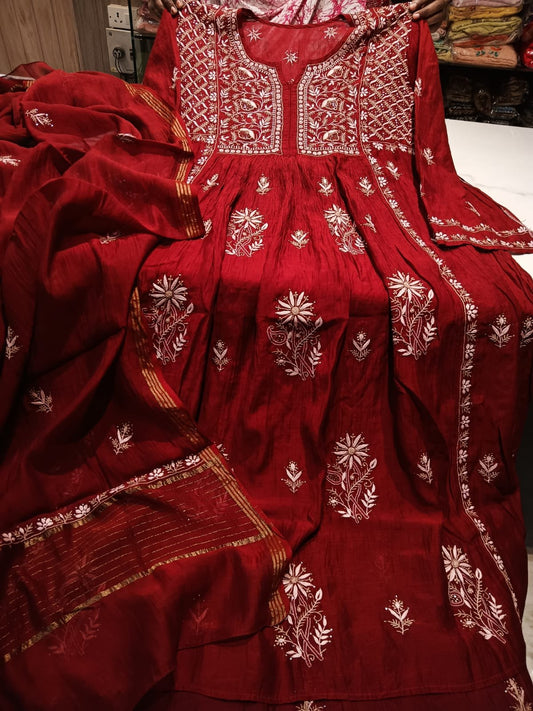 Pure Chanderi Luxurious Anarkali Kurta Set With Ek taar Chikankari