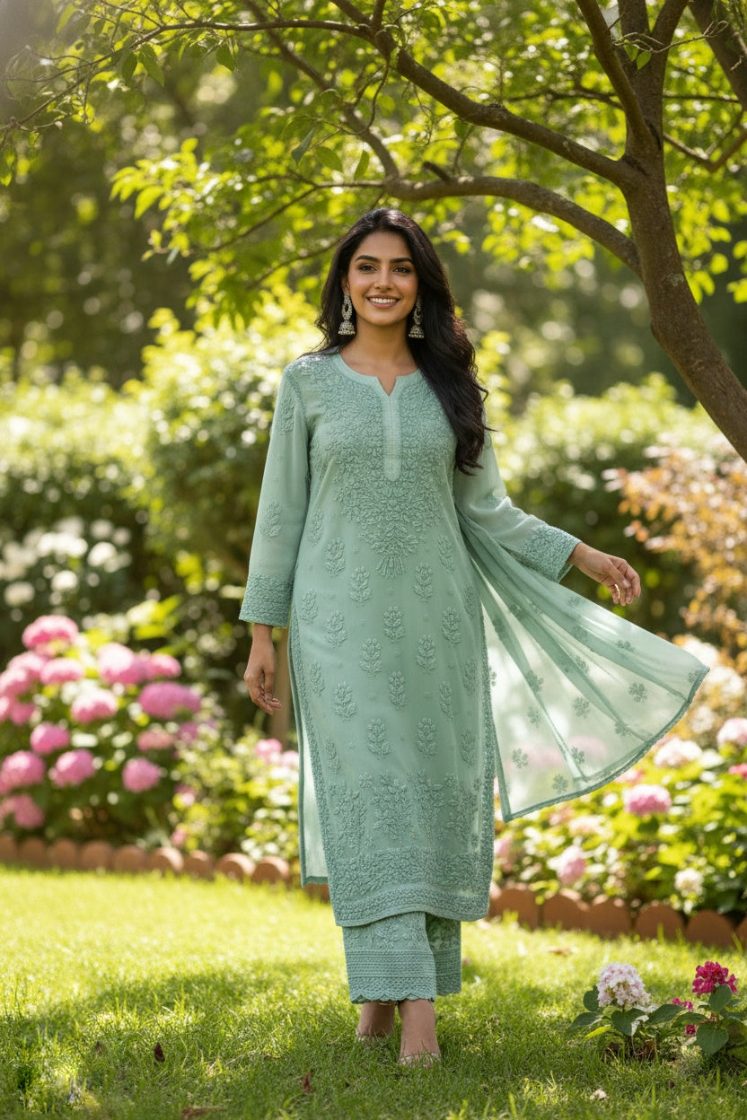 Adah Lace Bottom Premium Georgette Chikankari Luxurious Kurta Set ( Embroidered Dupatta)