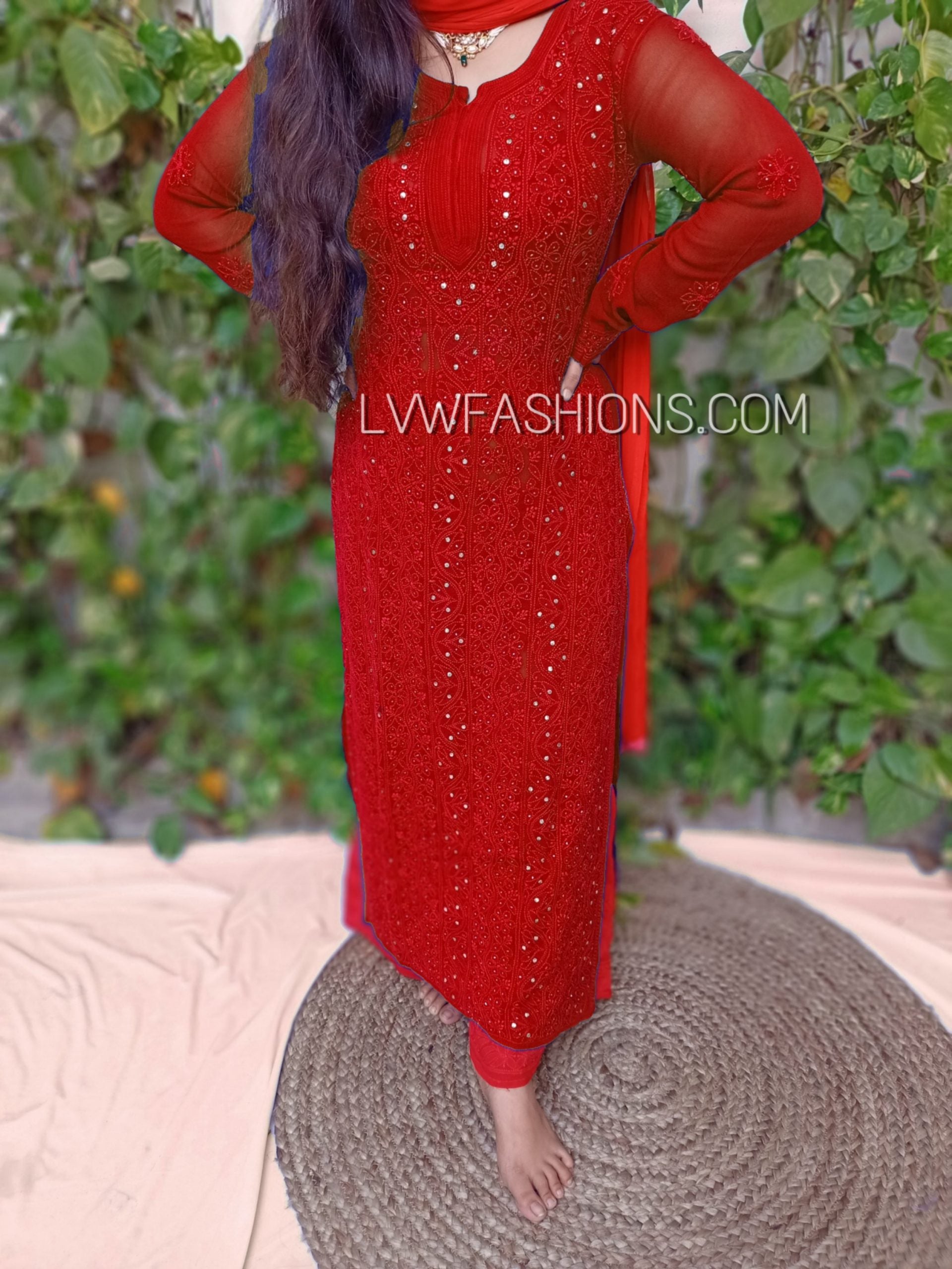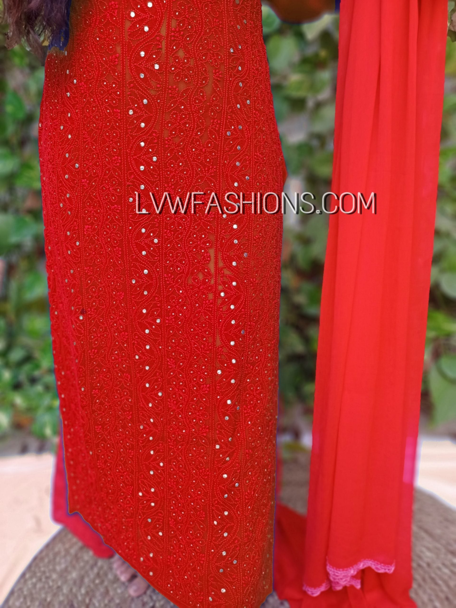 Beautiful Premium Georgette Deep Red 3 Piece Set