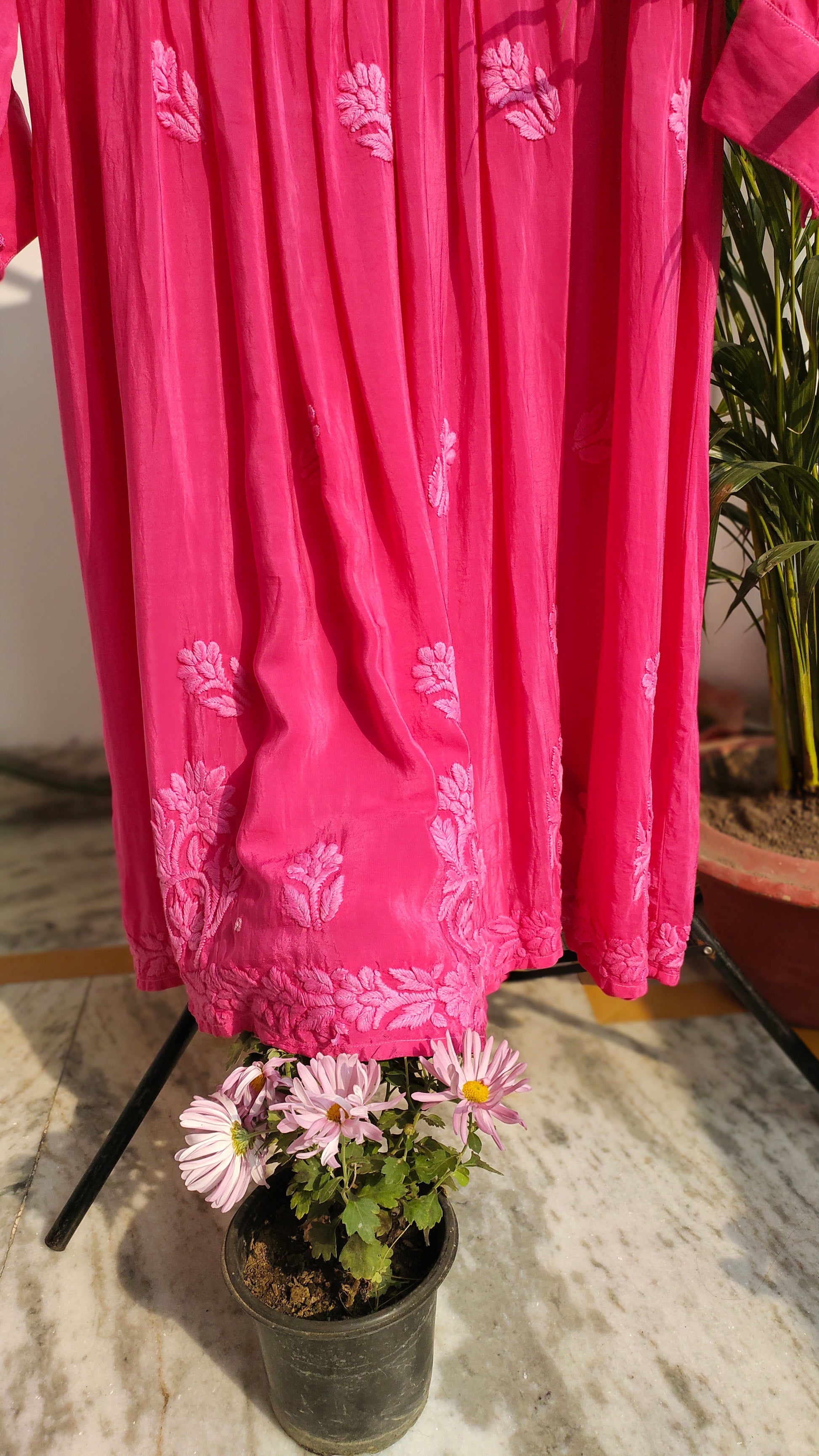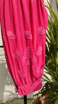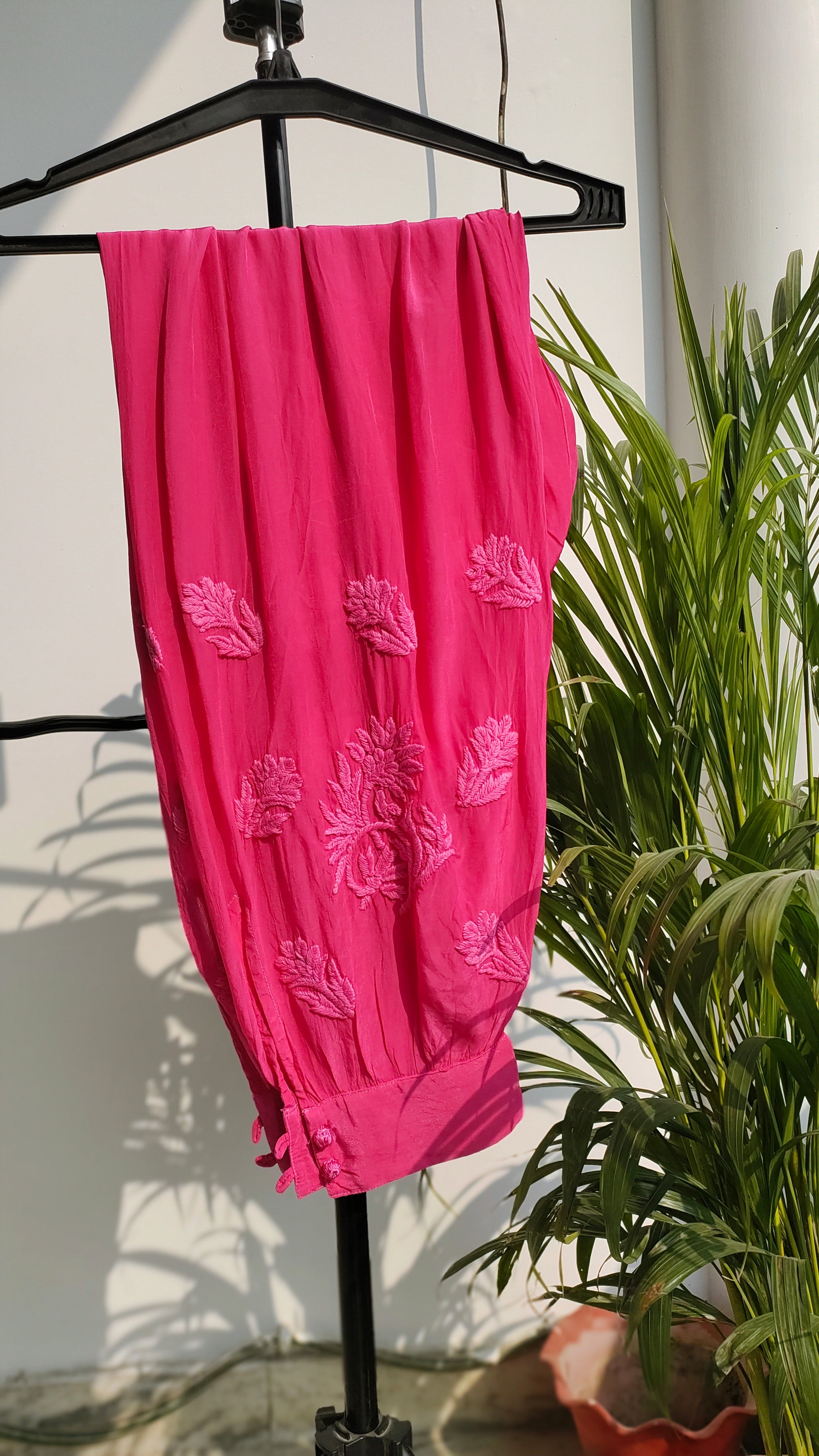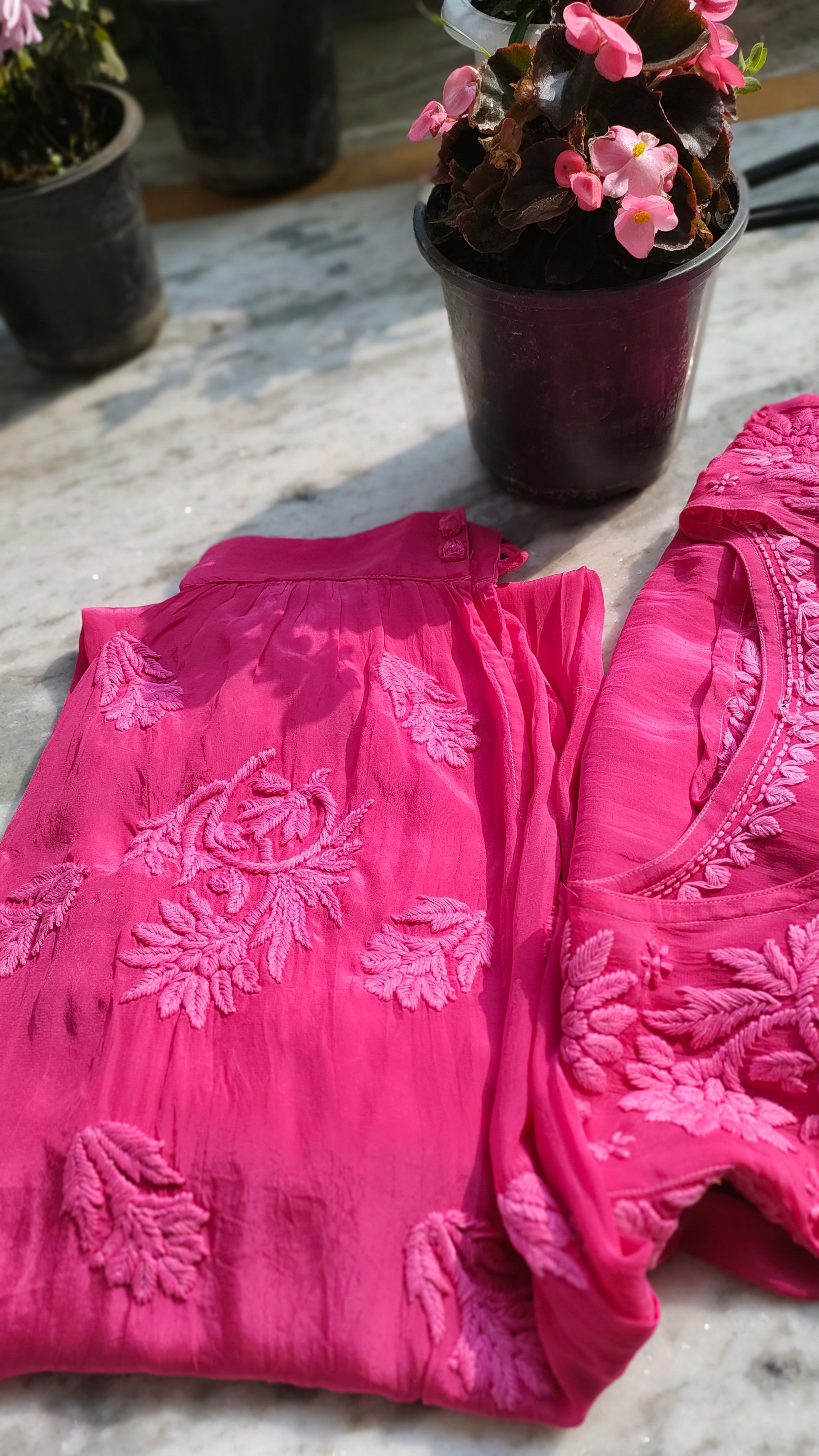 Candy hot Pink Afghani set This set features intricate Chikankari work, adding an element of elegance to the outfit. The set includes a short kurta and bottom, making it the perfect choice for a casual yet stylish look.his Candy Hot Pink Premium silk Afgani Set is made from 100% pure silk fabric, ensuring high quality and a luxurious feel. The set includes a stylish Afgani kurta co-ord, perfect for any occasion. With a regular short length of 32+, this set is comfortable and flattering. Dupatta not included.