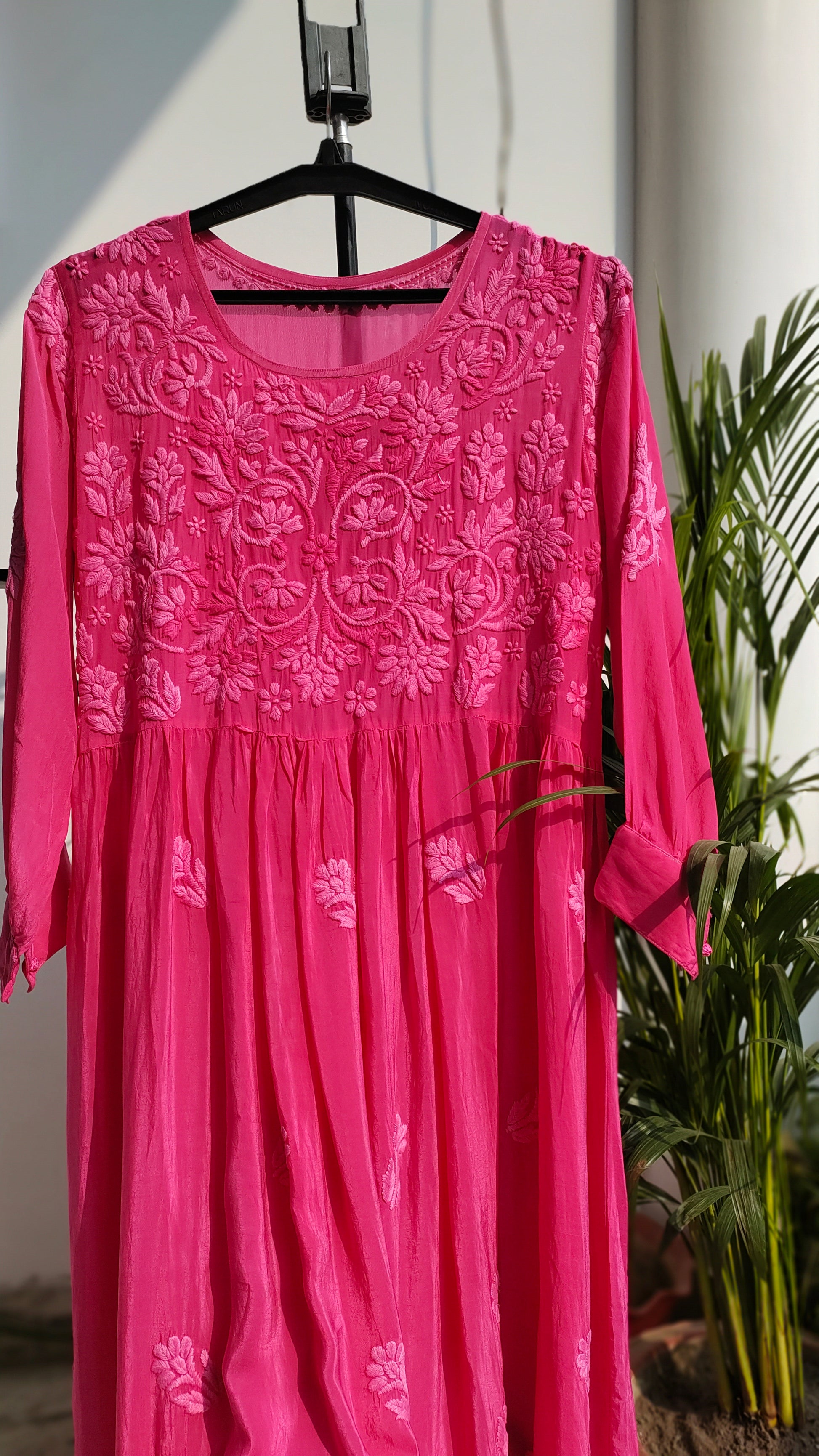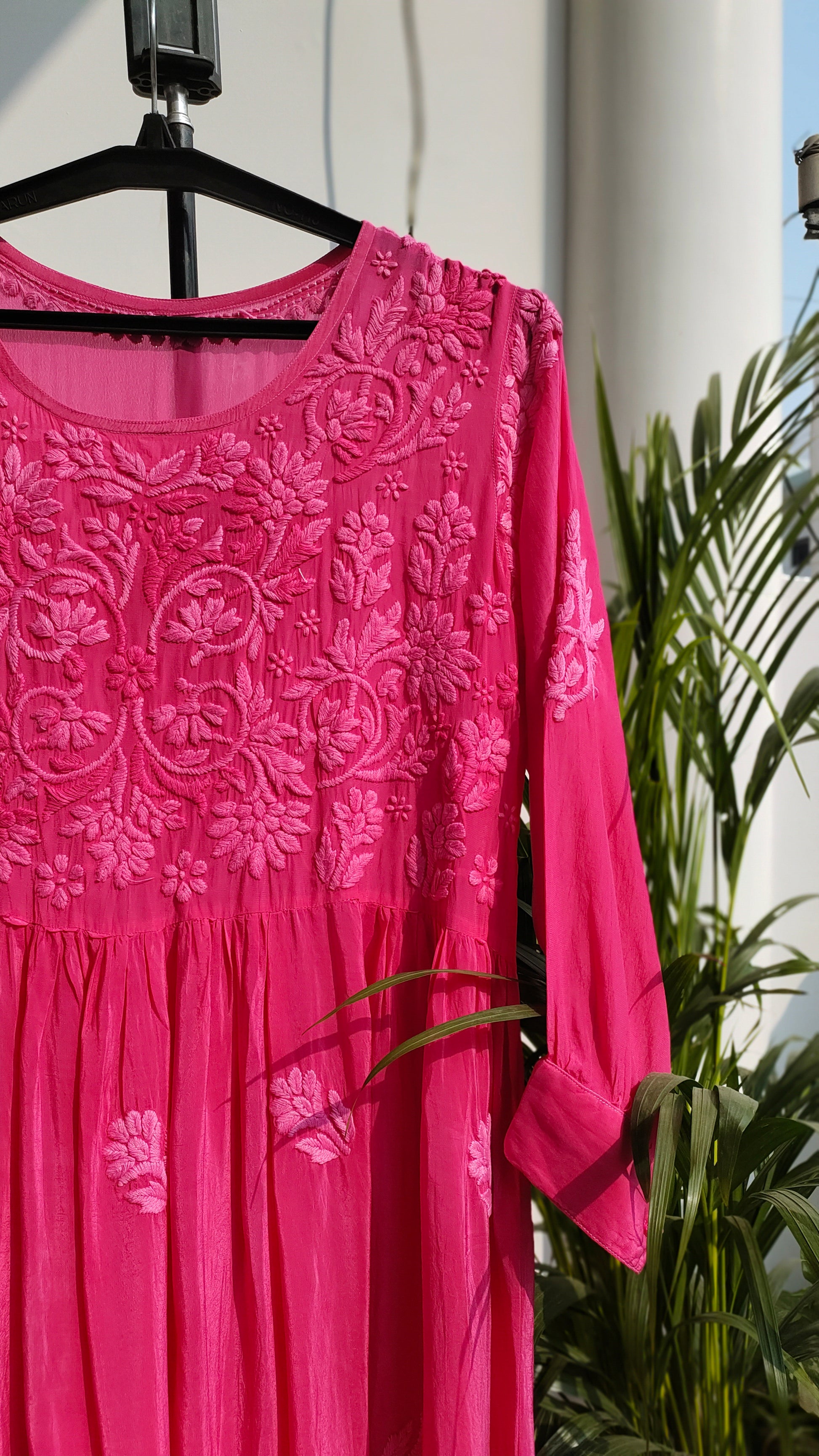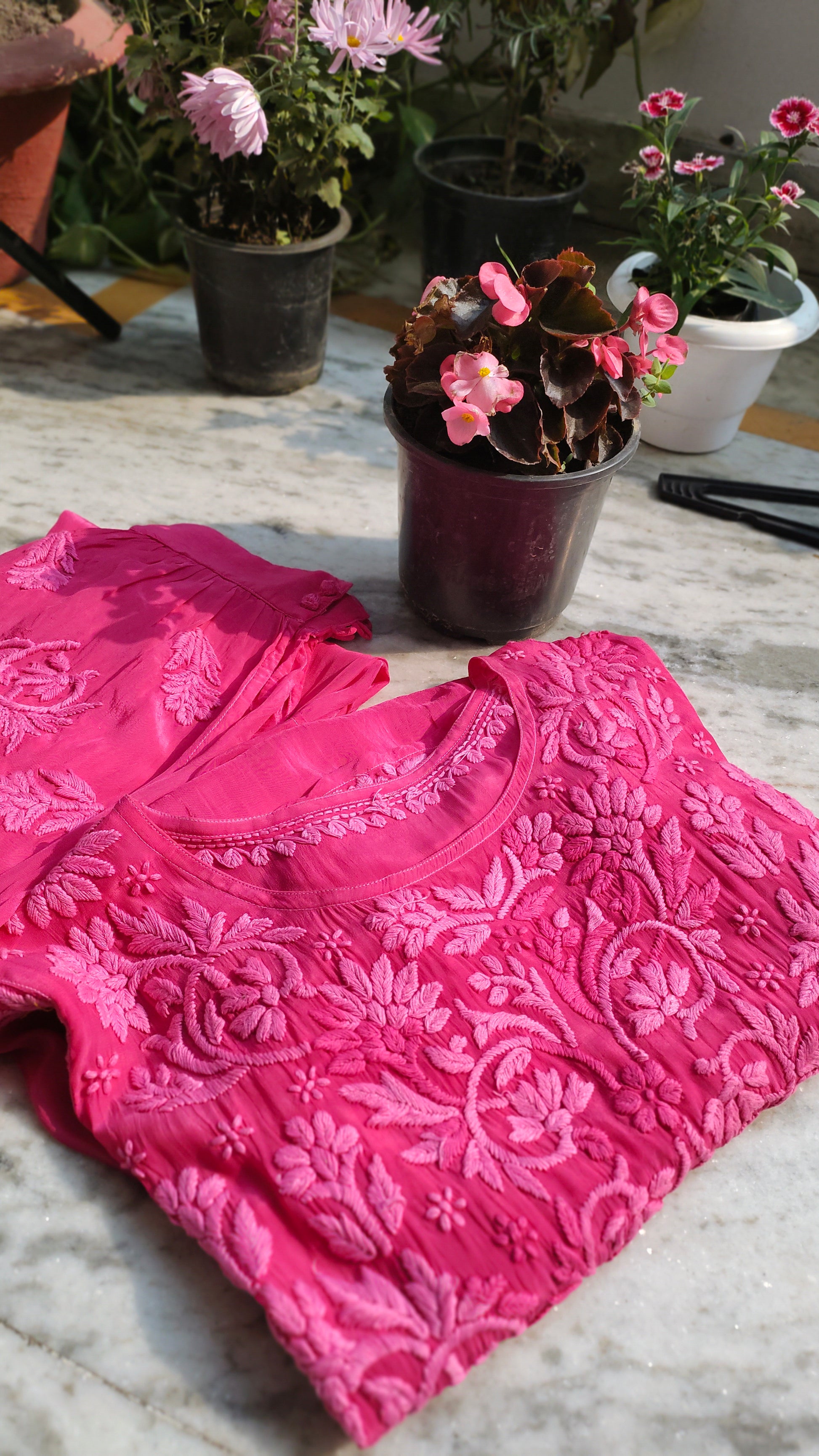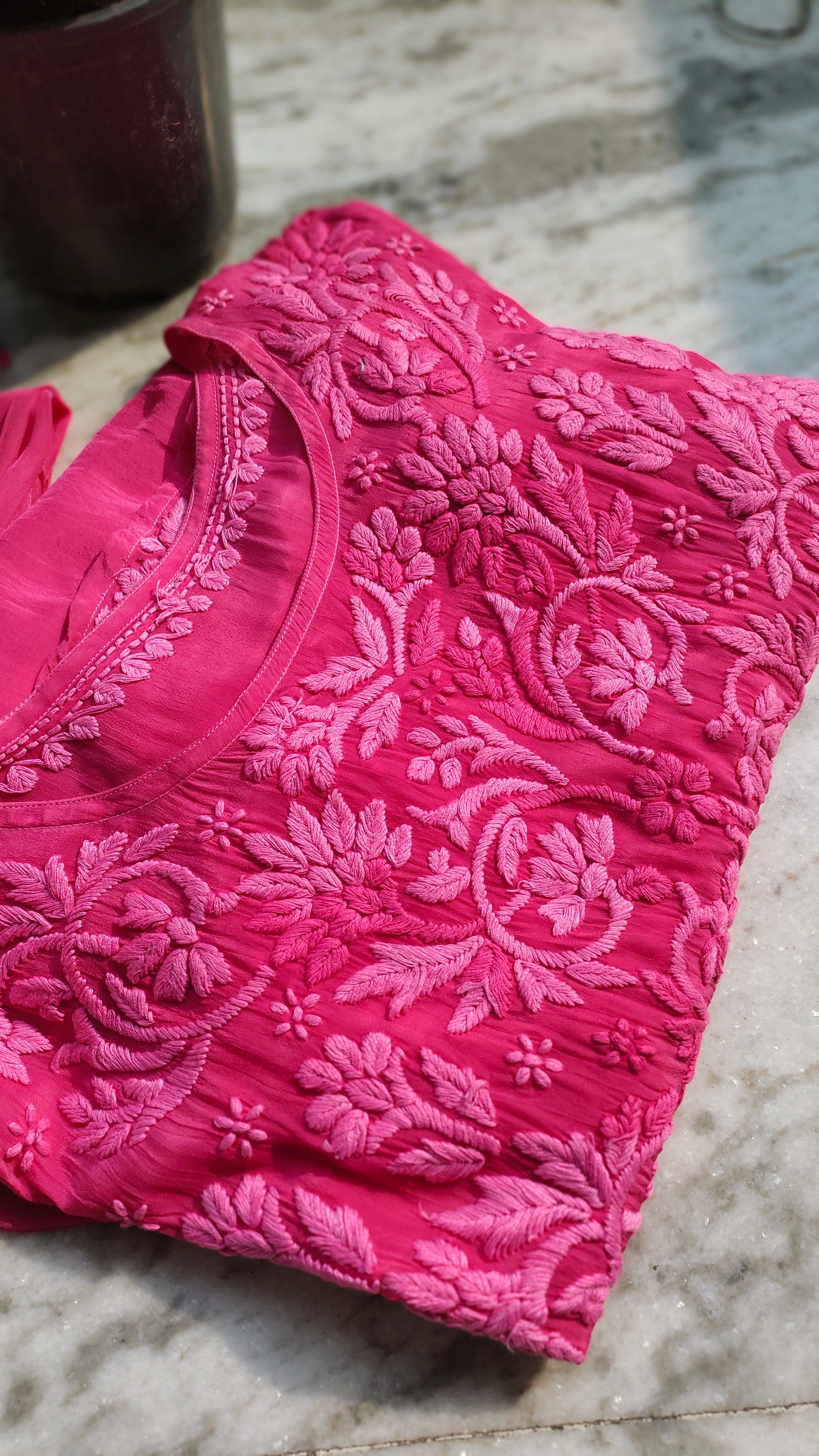 Candy hot Pink Afghani set This set features intricate Chikankari work, adding an element of elegance to the outfit. The set includes a short kurta and bottom, making it the perfect choice for a casual yet stylish look.his Candy Hot Pink Premium silk Afgani Set is made from 100% pure silk fabric, ensuring high quality and a luxurious feel. The set includes a stylish Afgani kurta co-ord, perfect for any occasion. With a regular short length of 32+, this set is comfortable and flattering. Dupatta not included.