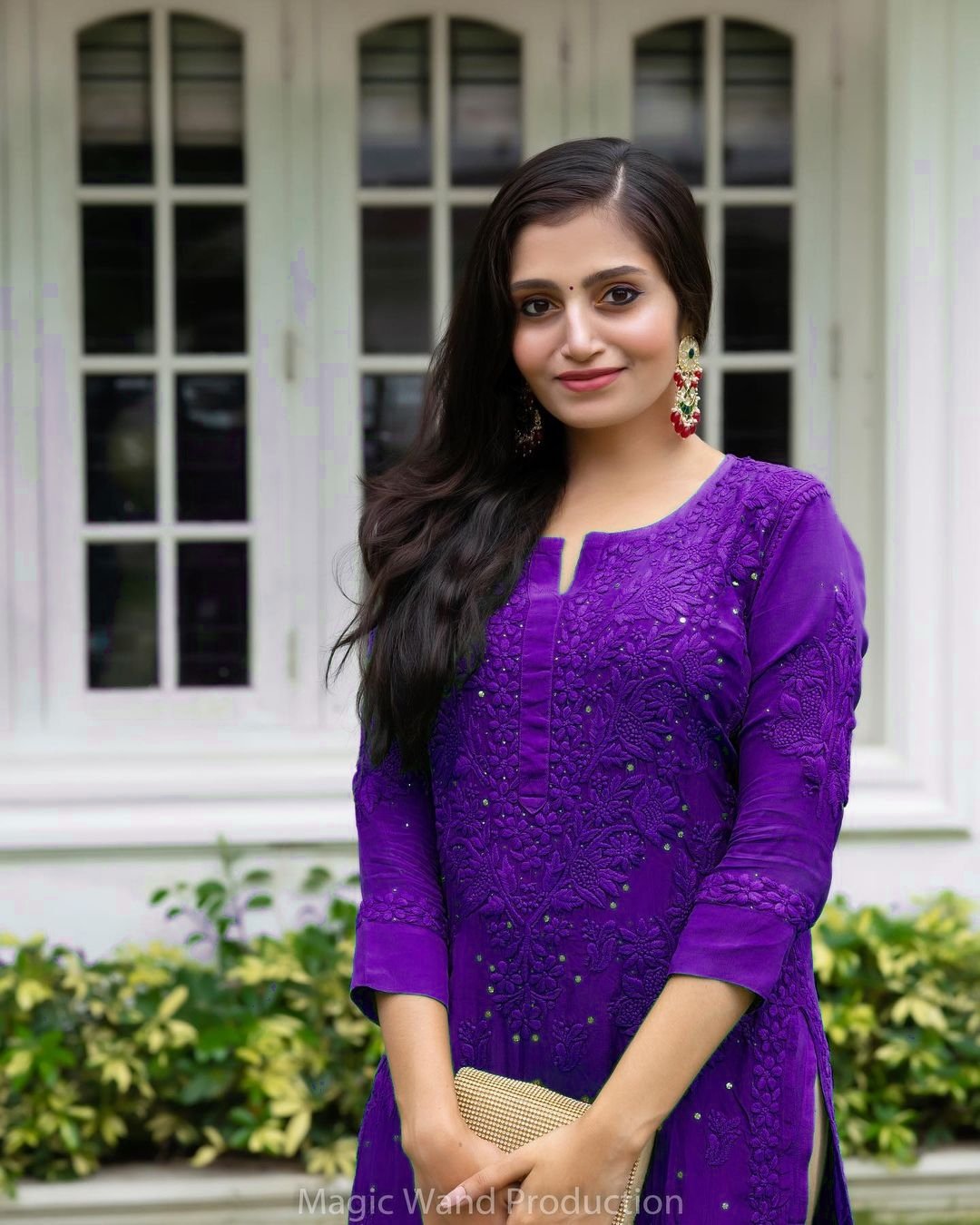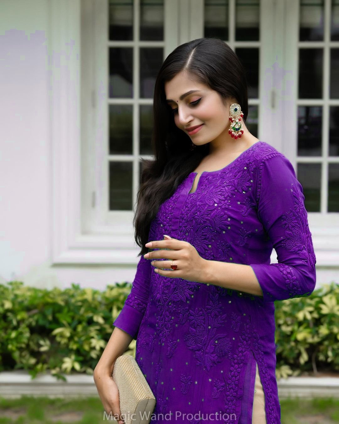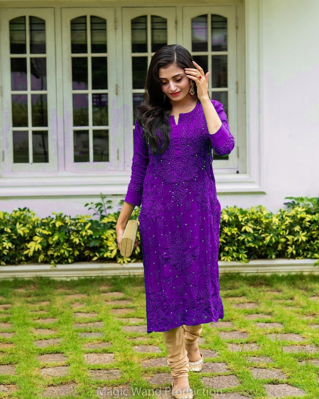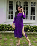 Celebrity Inspired Pure Bringle Purple Long Kurta With Chikankari & Kamdani Tikki