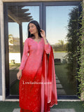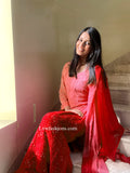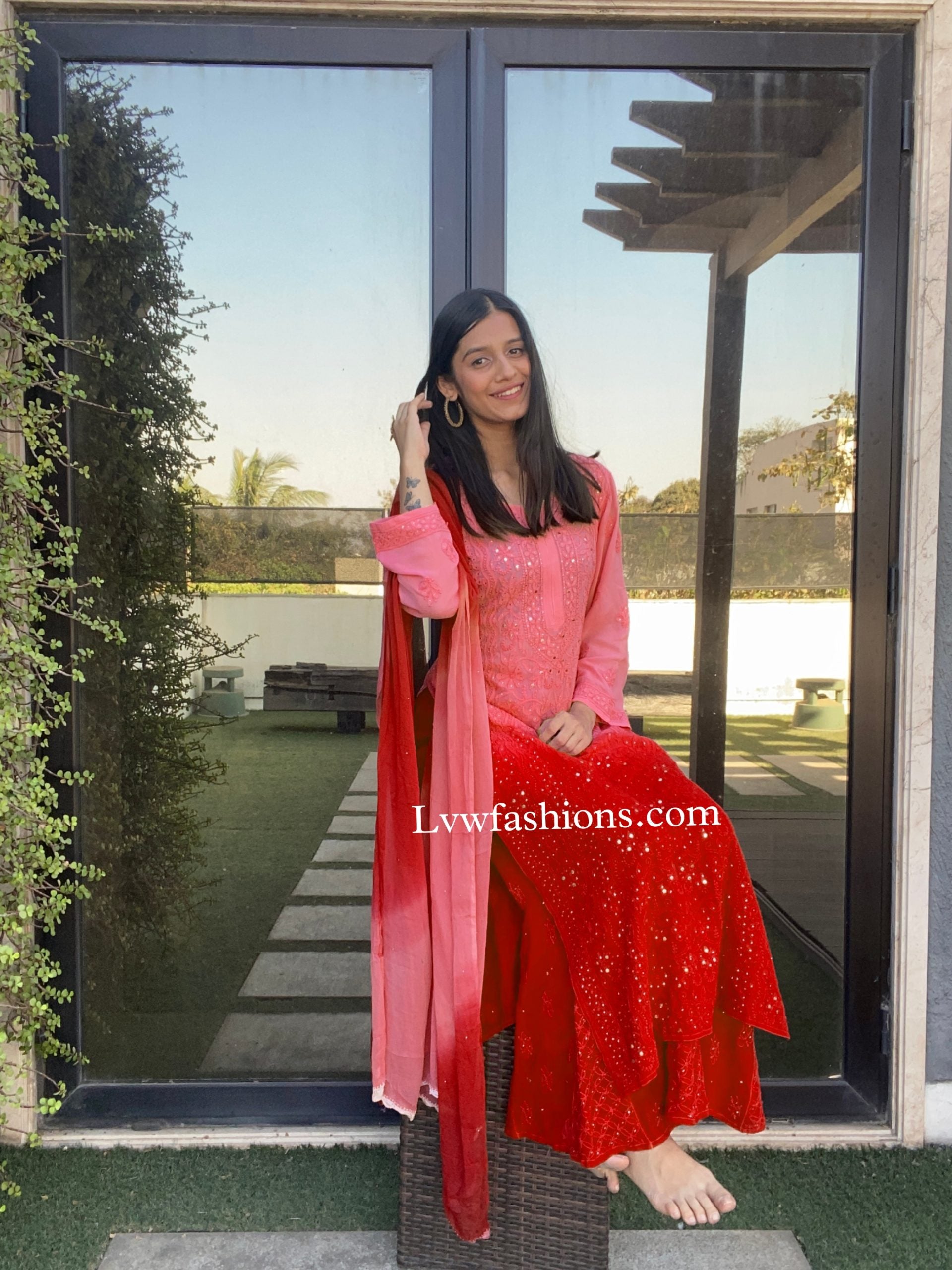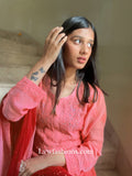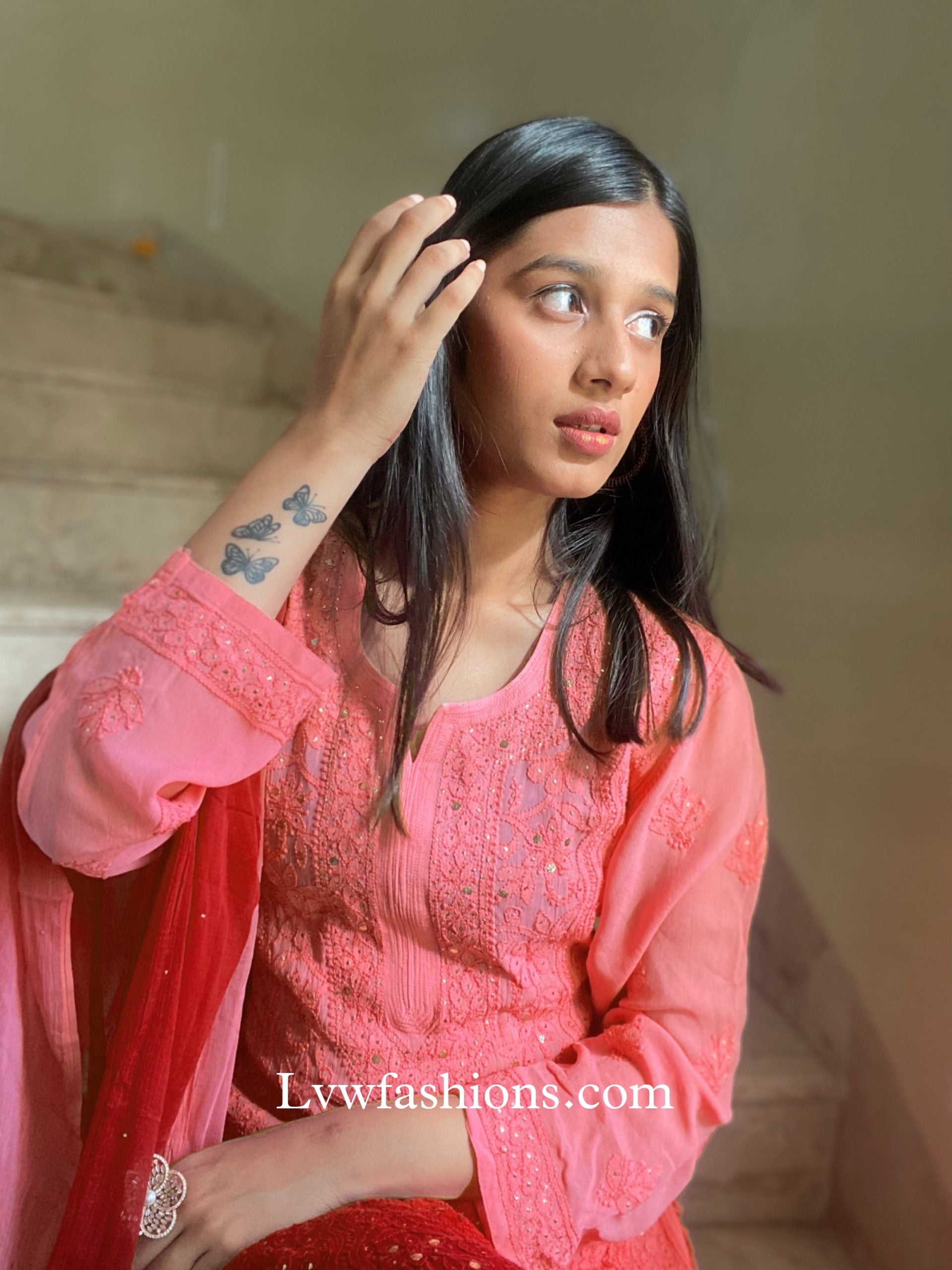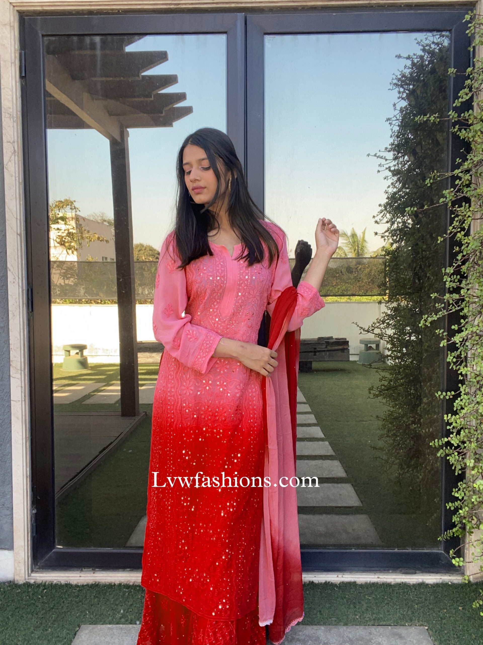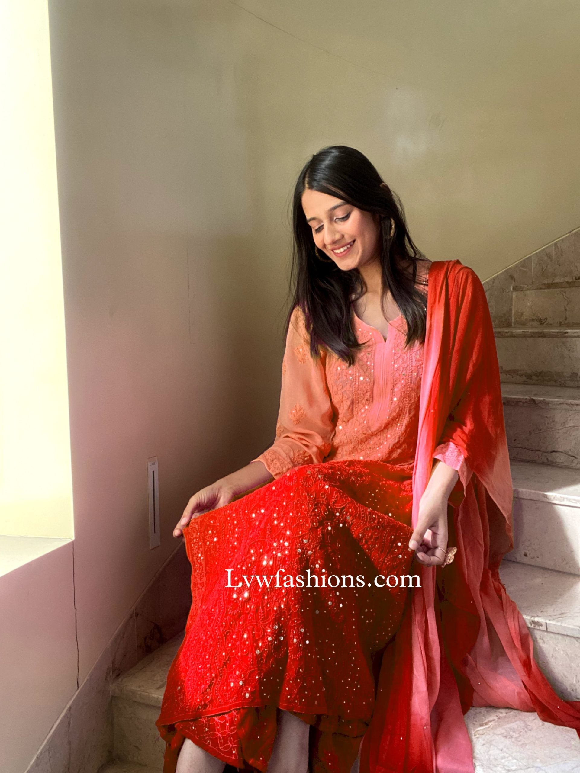 Cherry Red Premium Georgette 3 Piece Chikankari Set With Silk Slip