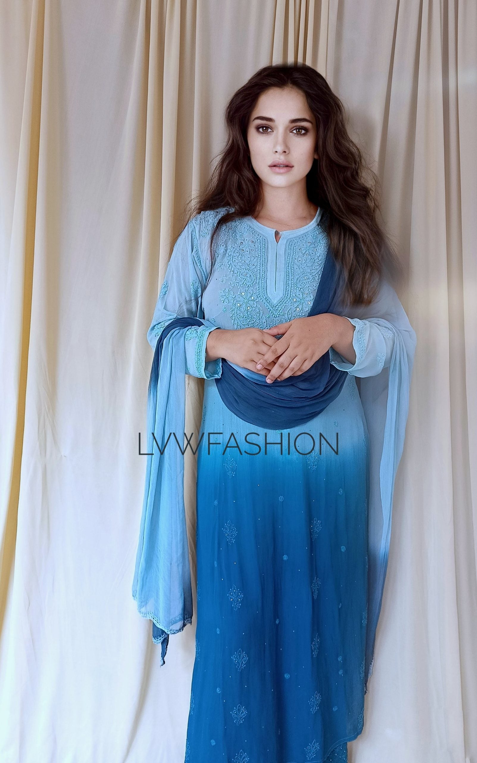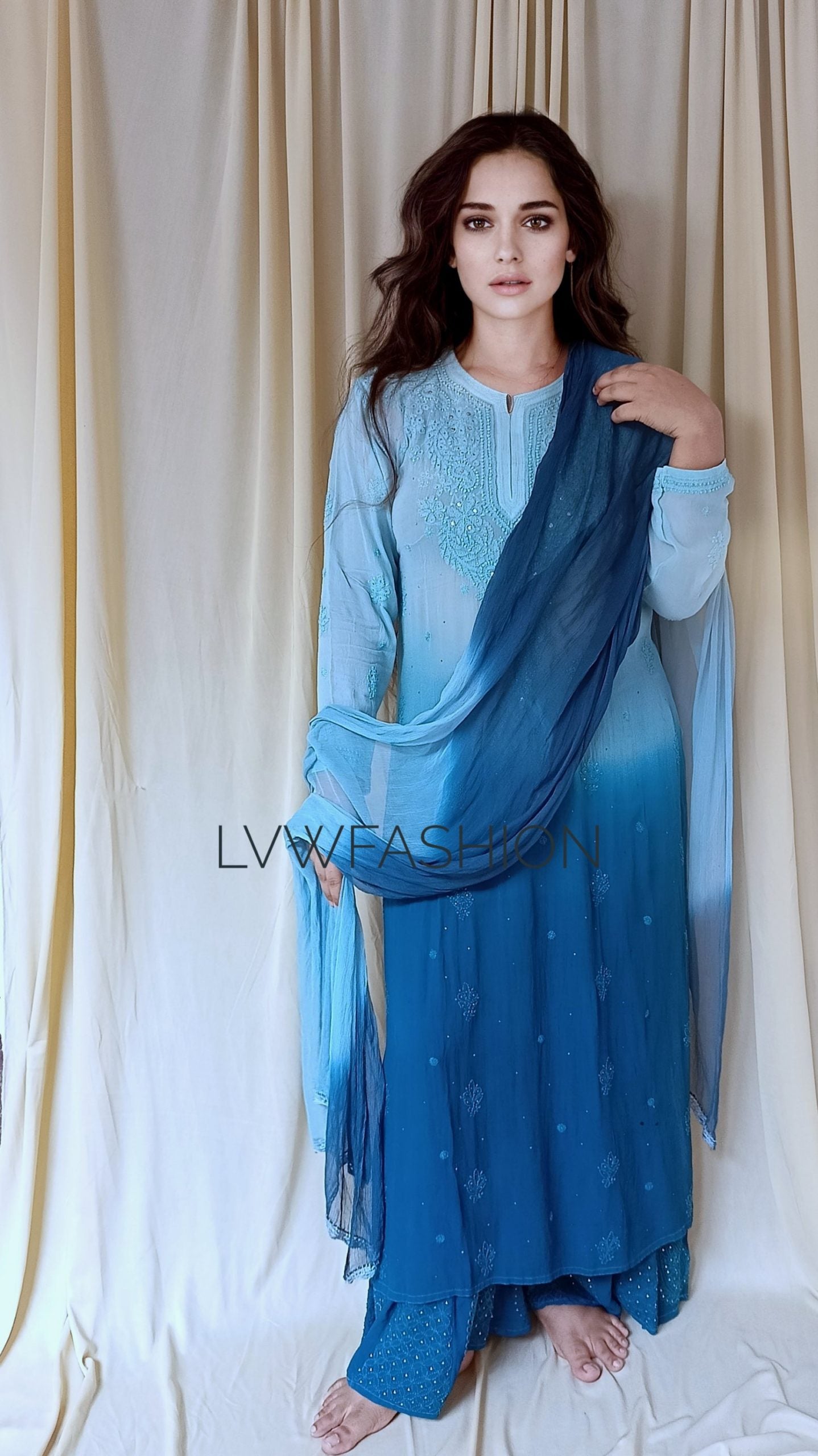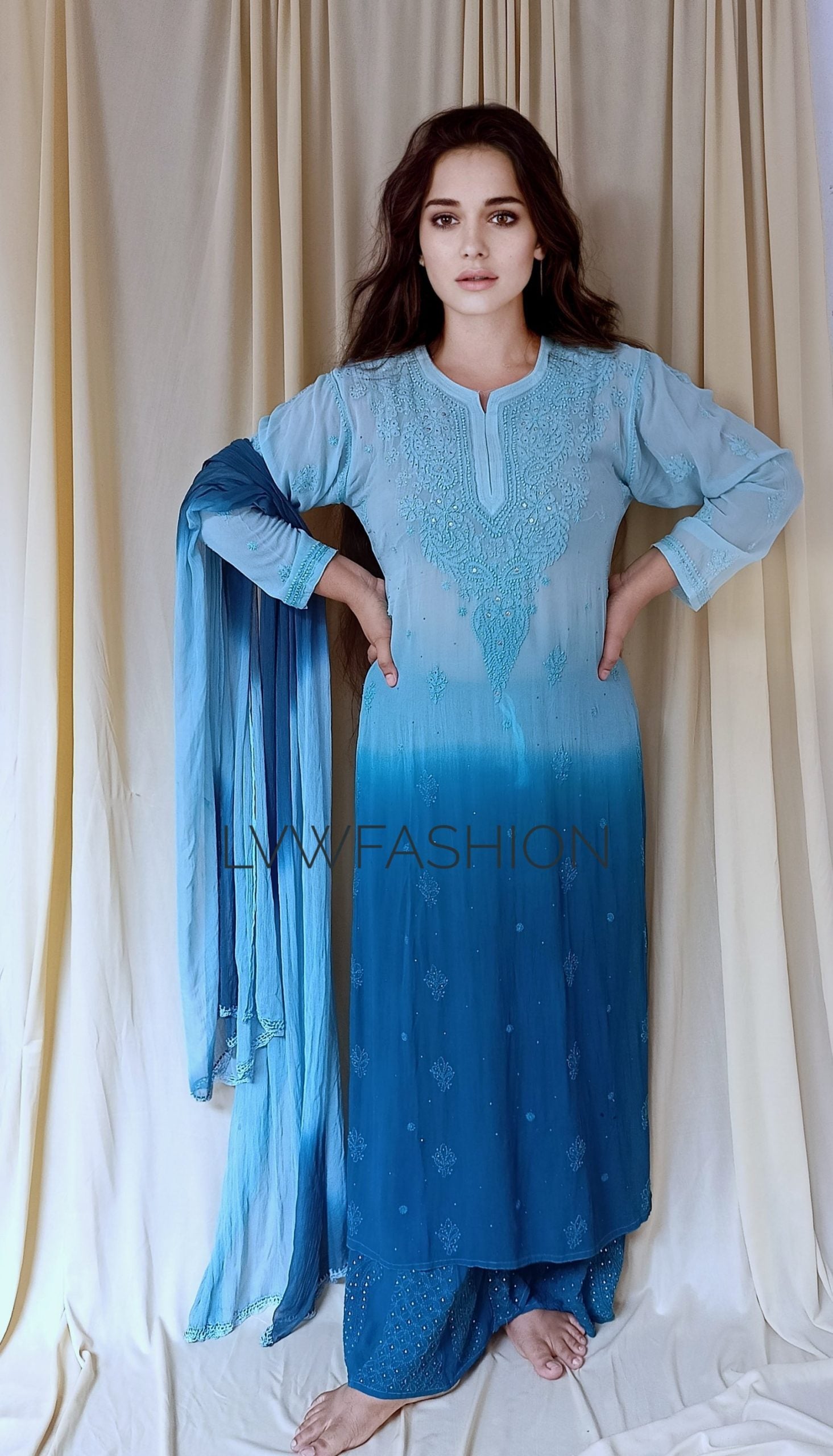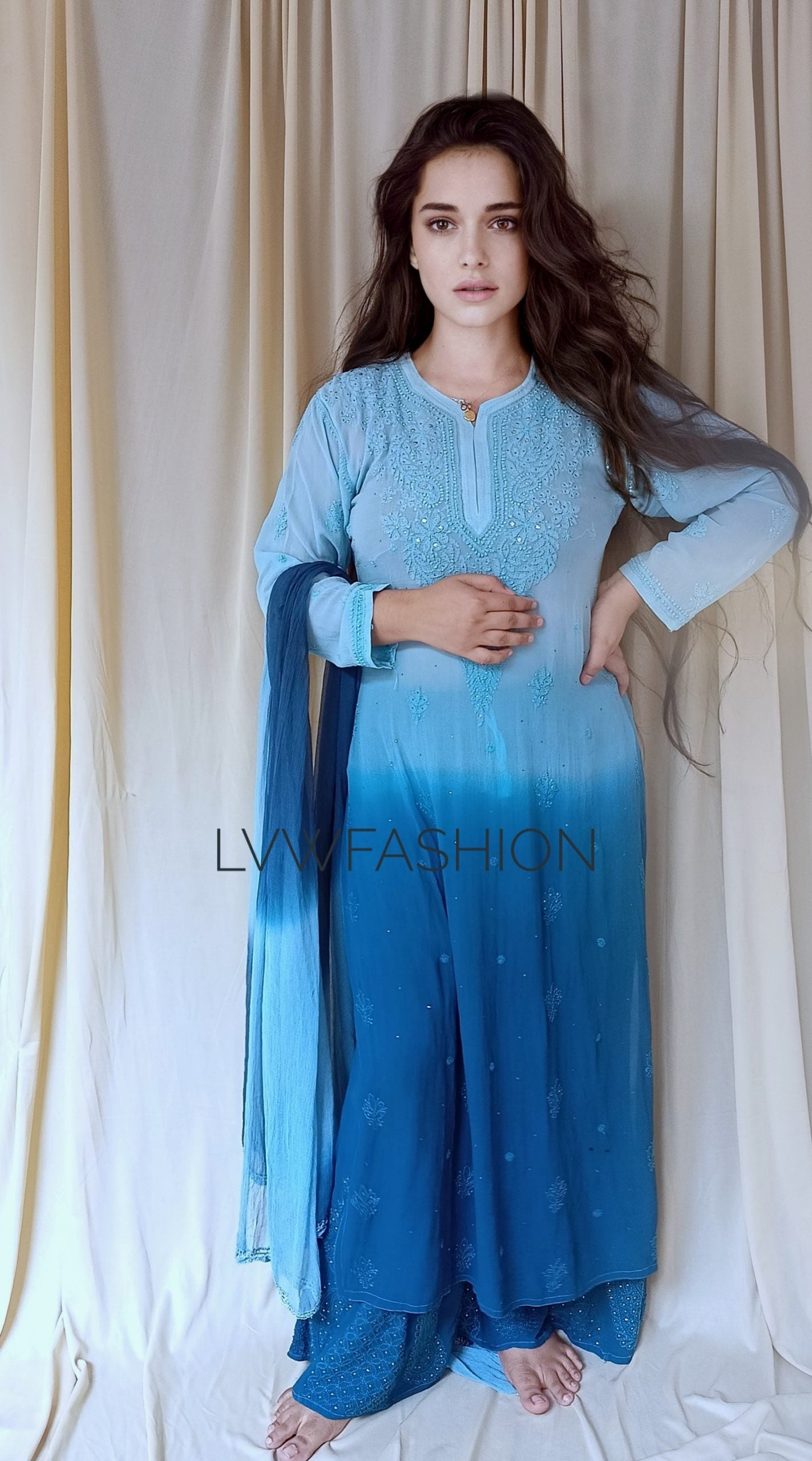 Christmas Blue Ombre Dye 3 Piece Set Premium Georgette