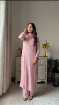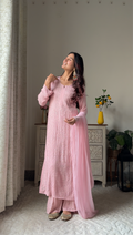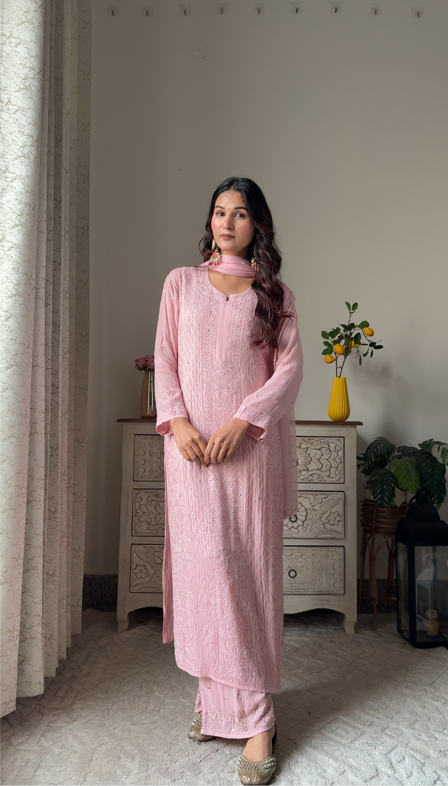 Farah Baby Pink Premium Georgette Chikankari Luxurious Kurti set for women Mukaish Add On