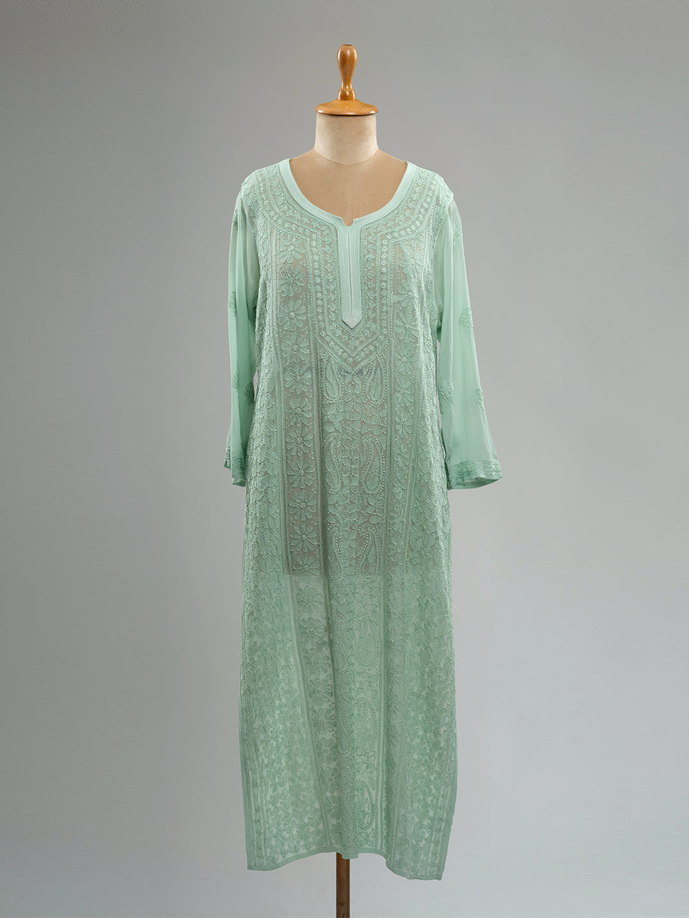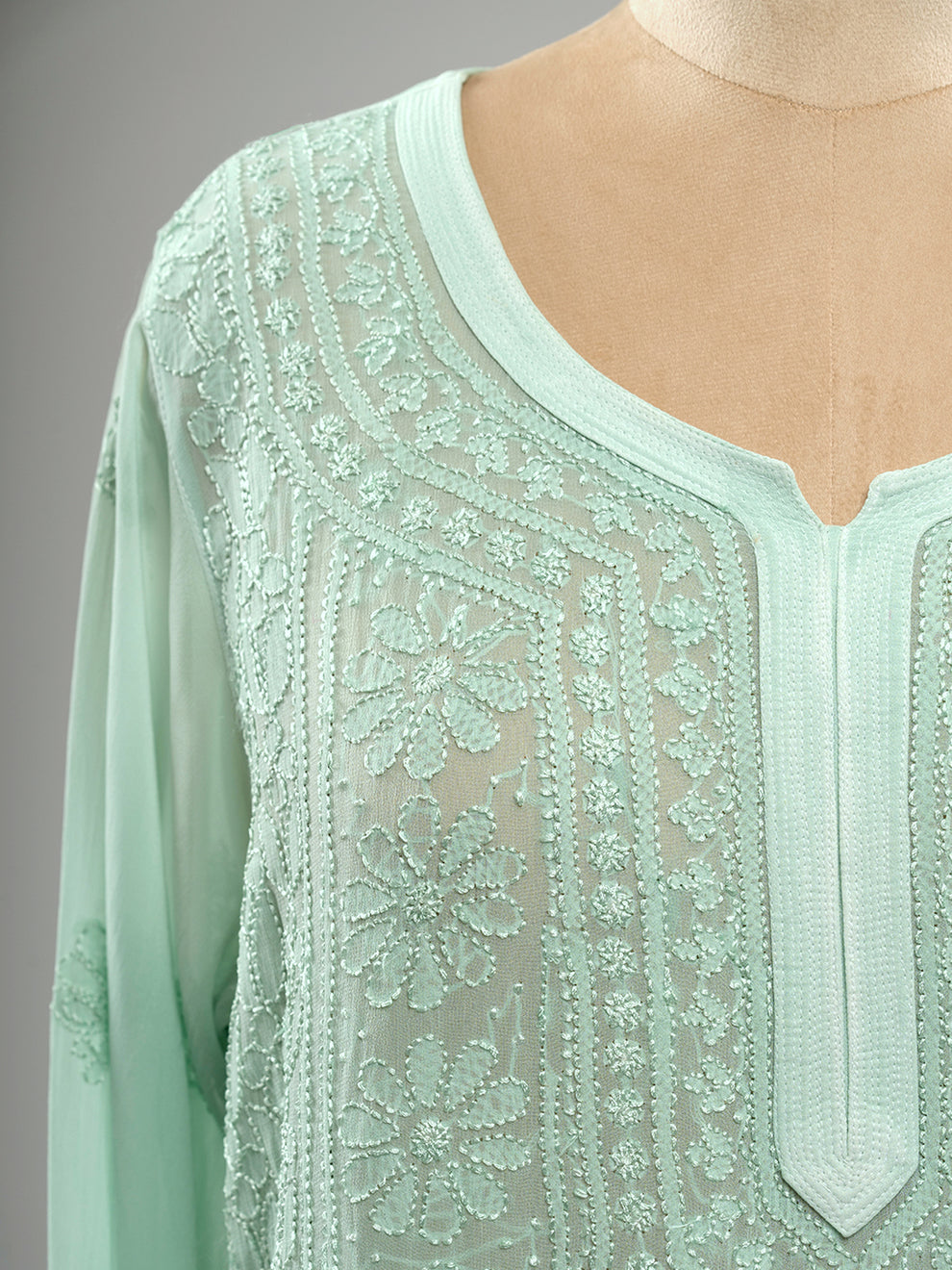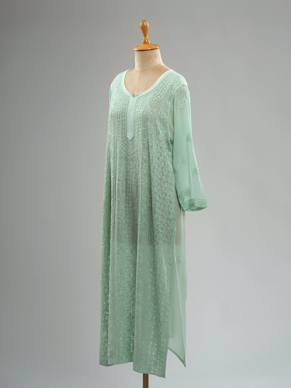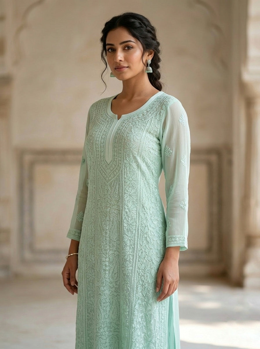 ; Premium Georgette Chikankari Kurta Embroidery , a luxurious and pure handmade chikankari kurta for women. Made with premium fabrics, this set exudes elegance and style. Enjoy free shipping in India and worldwide shipping available. Elevate your wardrobe with this exquisite chikankari suit