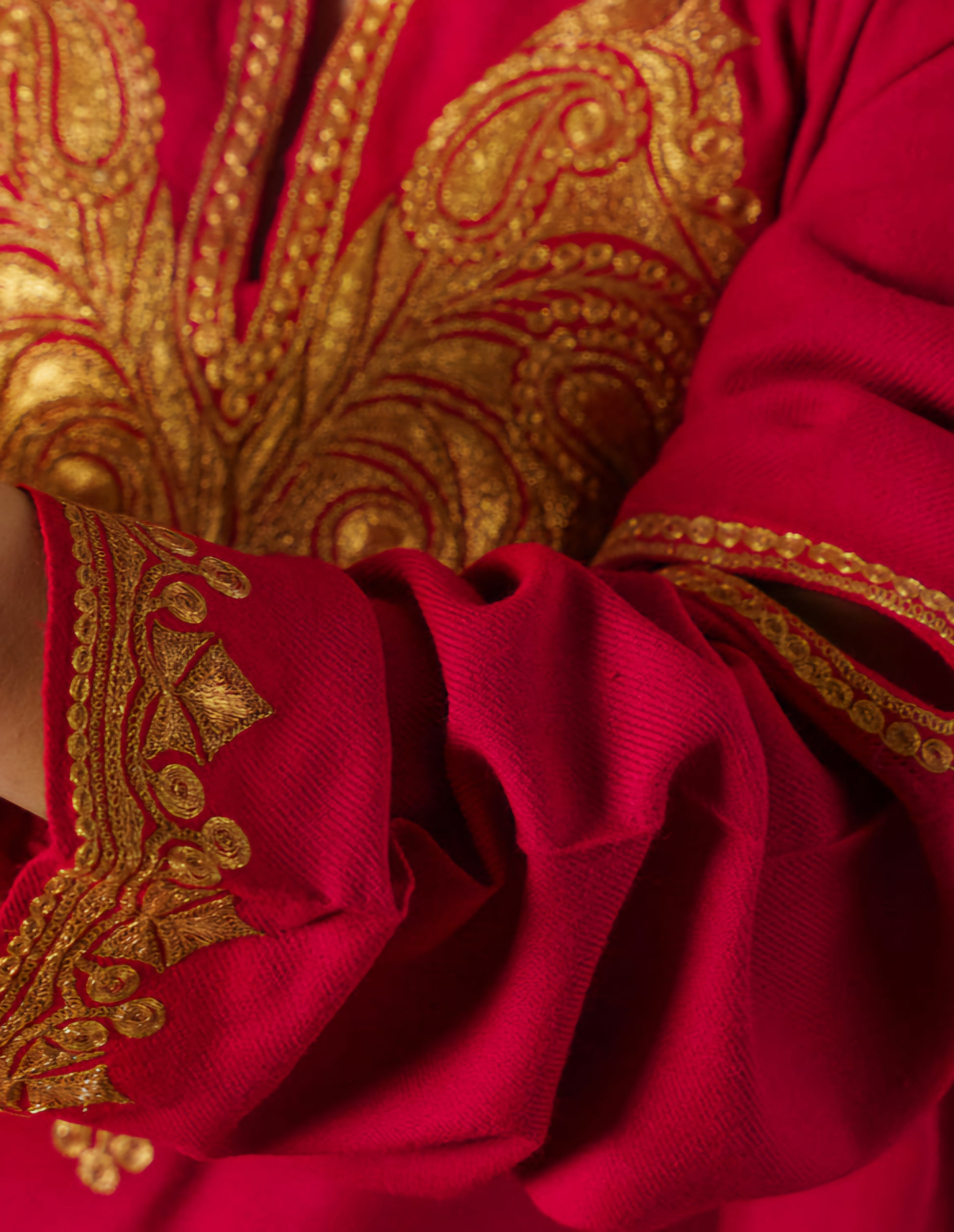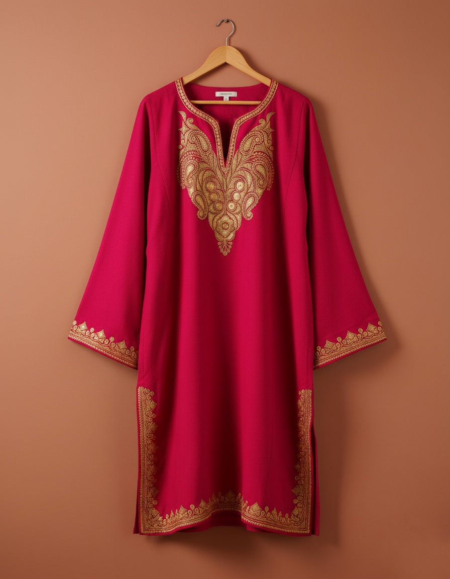 Double wearble Sleeves Kashmiri Golden Boti Tilla Embroidered Woollen Phiran – Magenta Pink | Handcrafted Heritage
