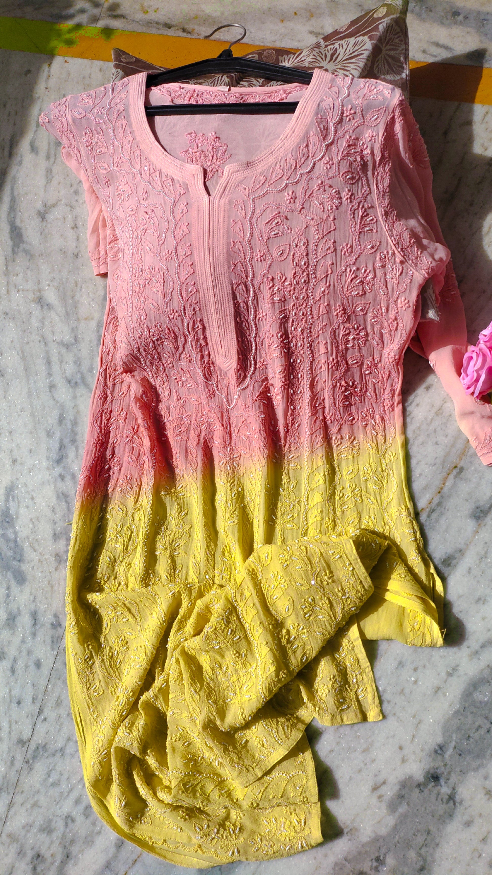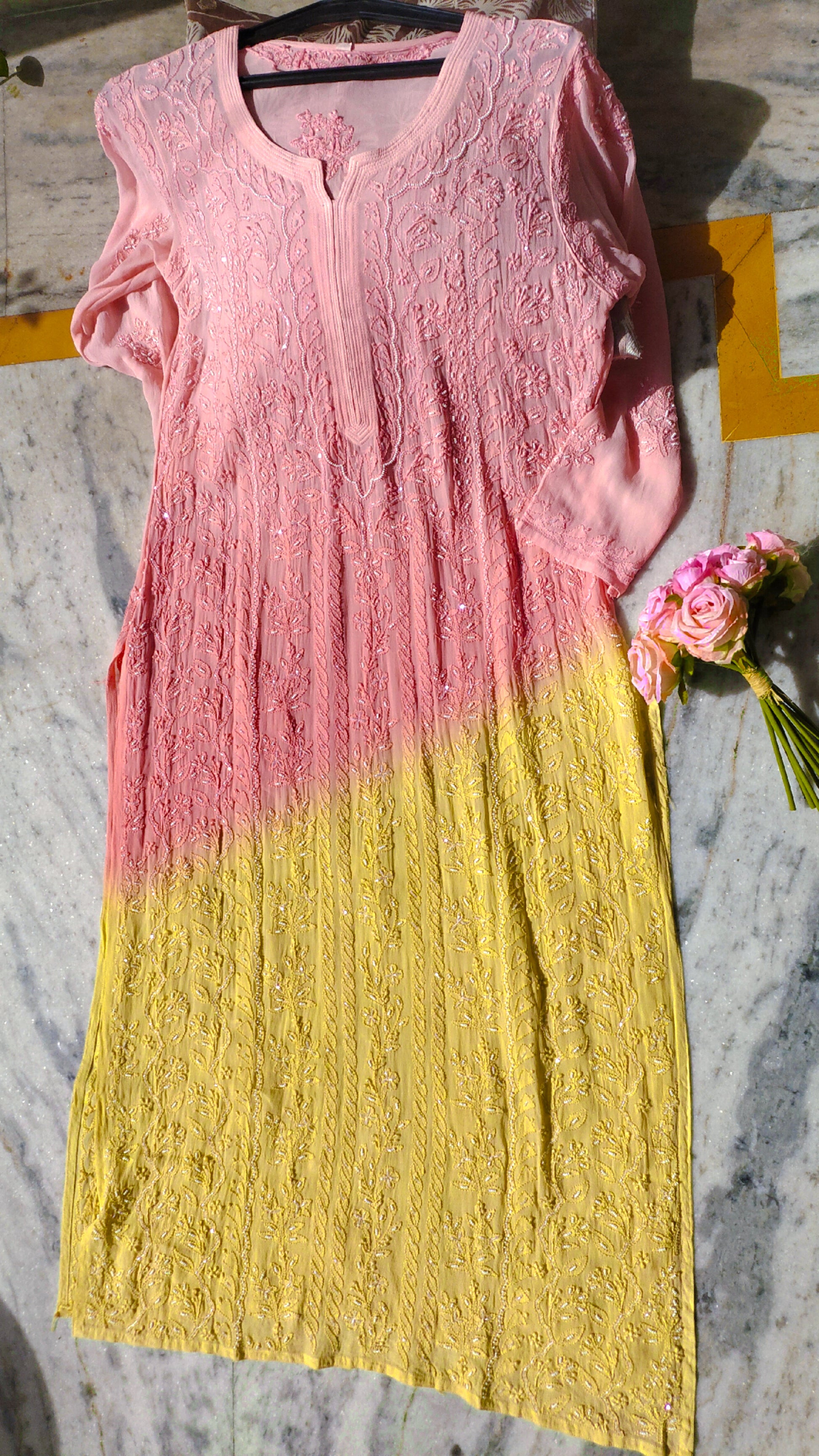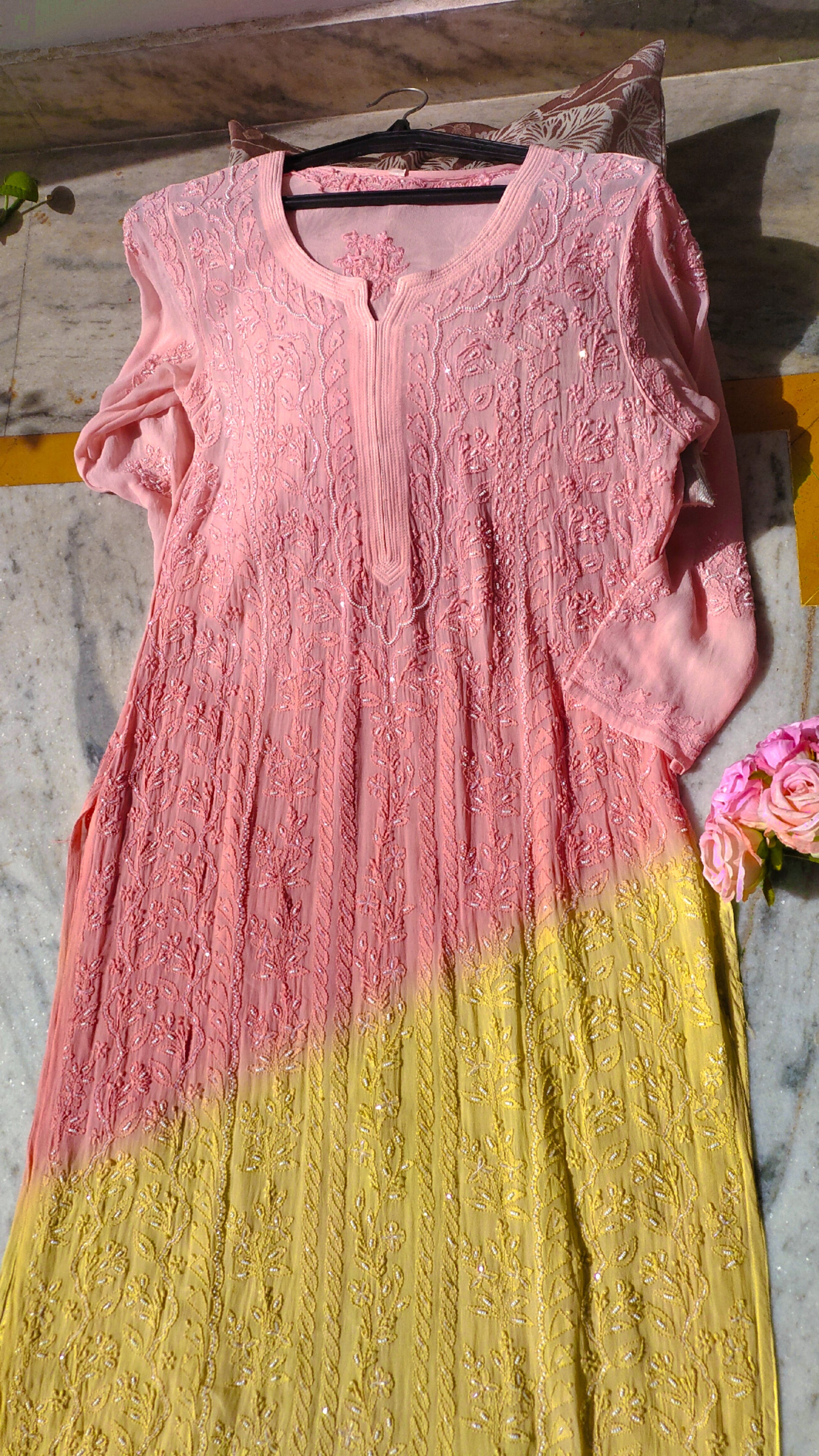 Double Shade Noori Full Jaal Pearl Cutdana Chikankari Embroidery Long Luxurious kurta Pure Handcrafted