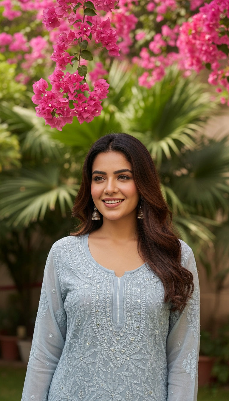 Hoor Gray Premium Georgette Chikankari Luxurious Long Kurta With Kamdani Add on