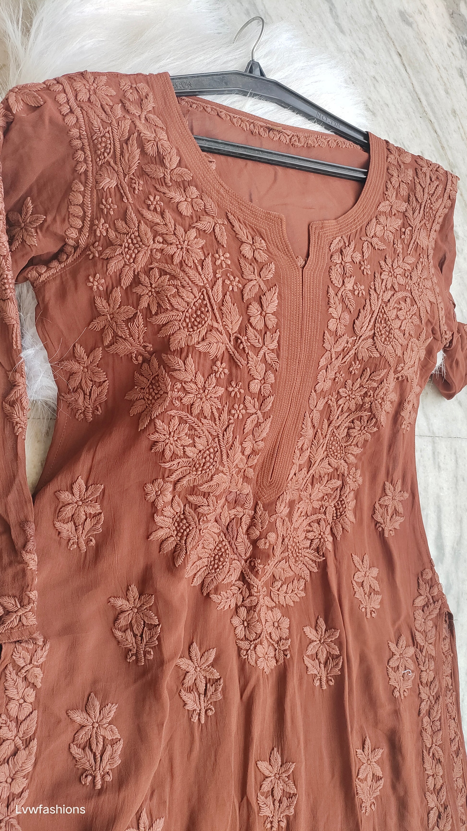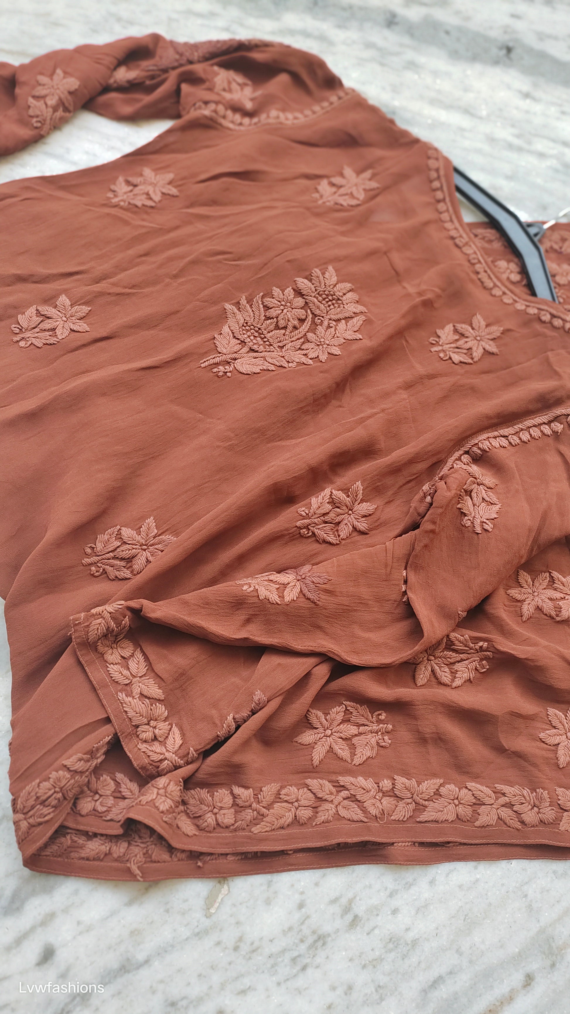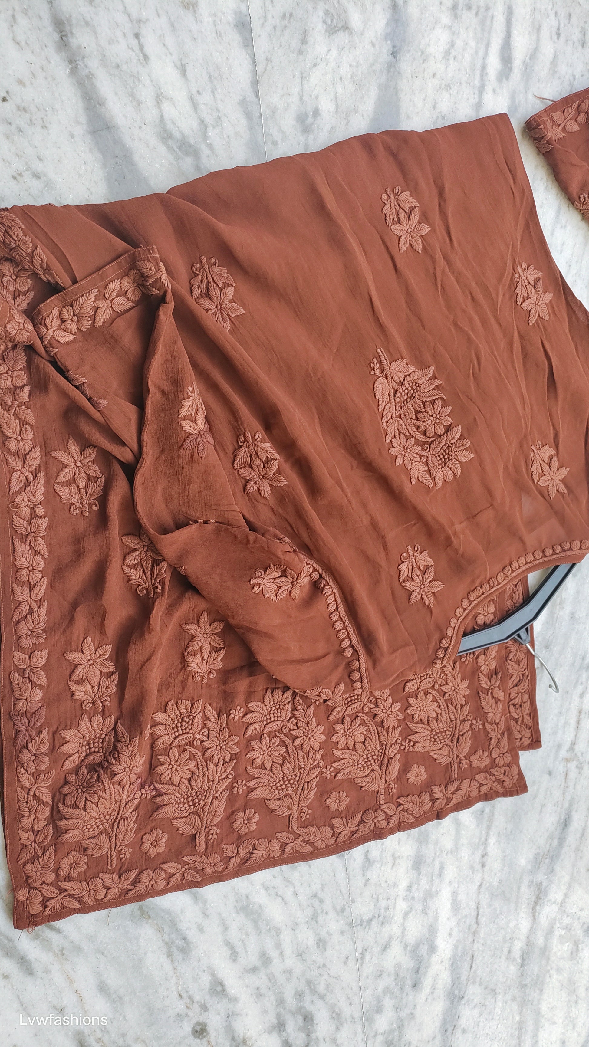 Noorani Brown Premium Georgette Chikankari Daman Booti Kurta