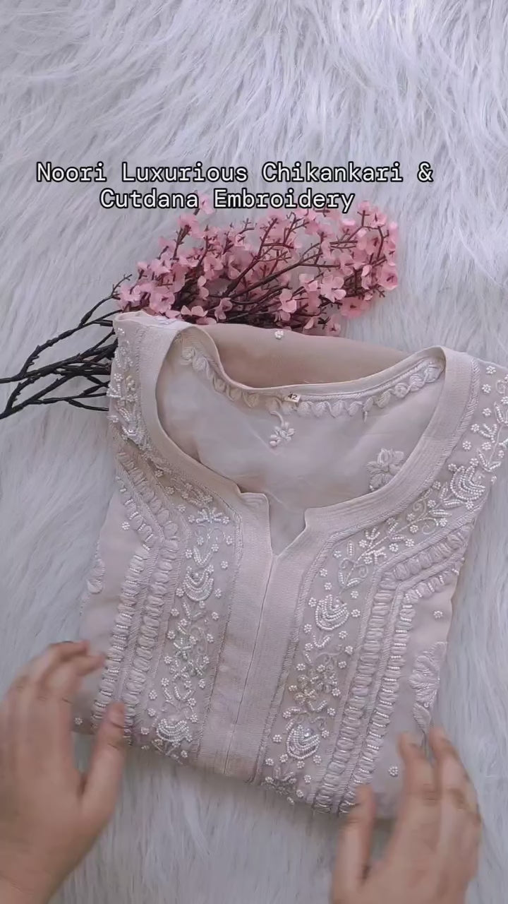 Enhance your wardrobe with our Noori Luxurious Look Chikankari Kurta. Handcrafted with precision, this kurta set not only boasts a premium fabric but also features intricate Chikankari embroidery with pearls and cutdana detailing. Elevate your style with this luxurious and timeless piece.