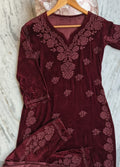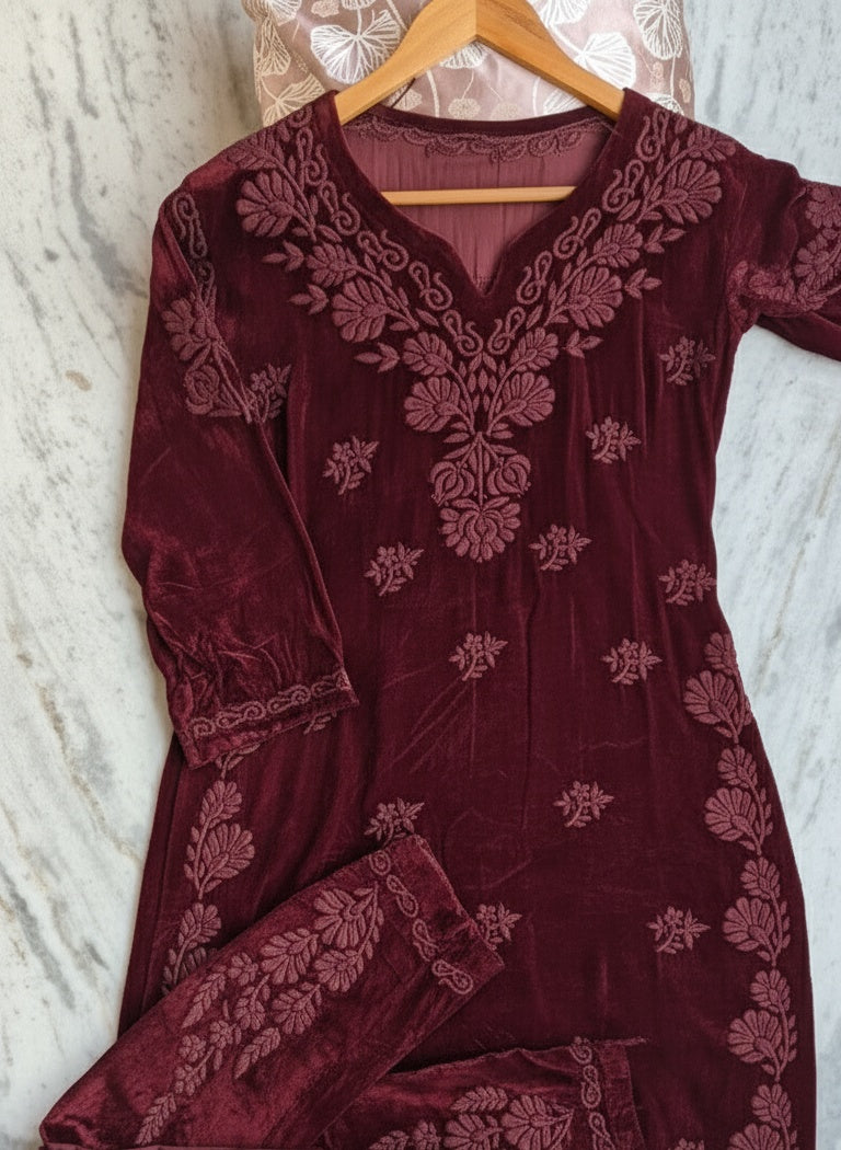 Super Maroon makhmal Chikankari Co-ord Set Luxurious Embroidery Pure Handcrafted